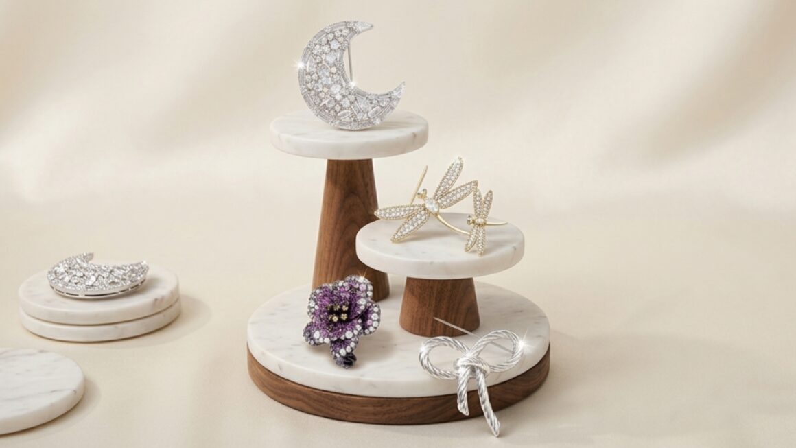 Pastel tonlarda bir blazer ceketin yakasına minimal bir broş eklemek, sade kombinlere zarif bir dokunuş katar.