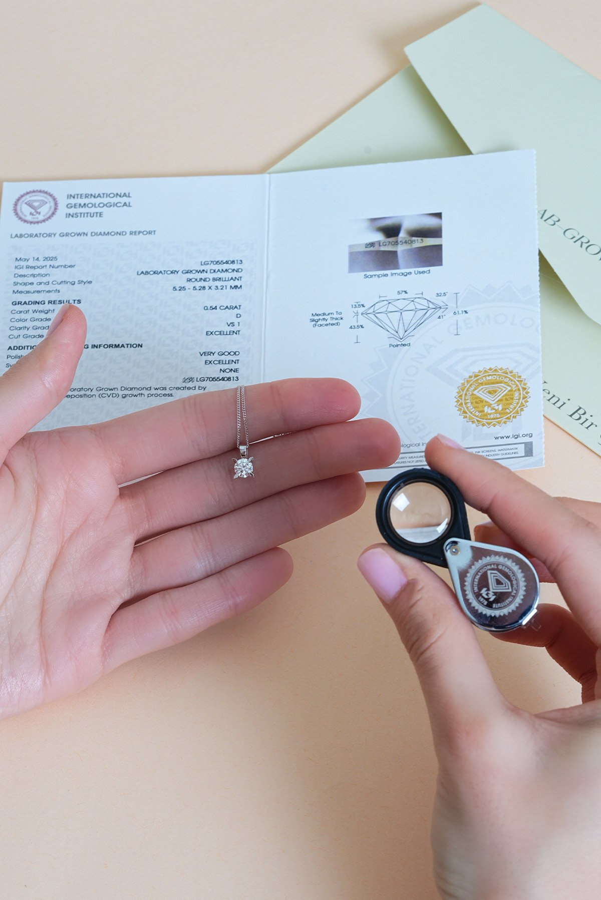 Kolyenizin merkezindeki pırlanta, dünyadaki tekil kimliğini belgeleyen LG705540813 benzersiz koduna sahiptir. IGI tescilli bu seri numarası, mücevherinizin orijinalliğini ve sadece size özel oluşunu garanti altına alan dijital bir sertifika niteliğindedir.