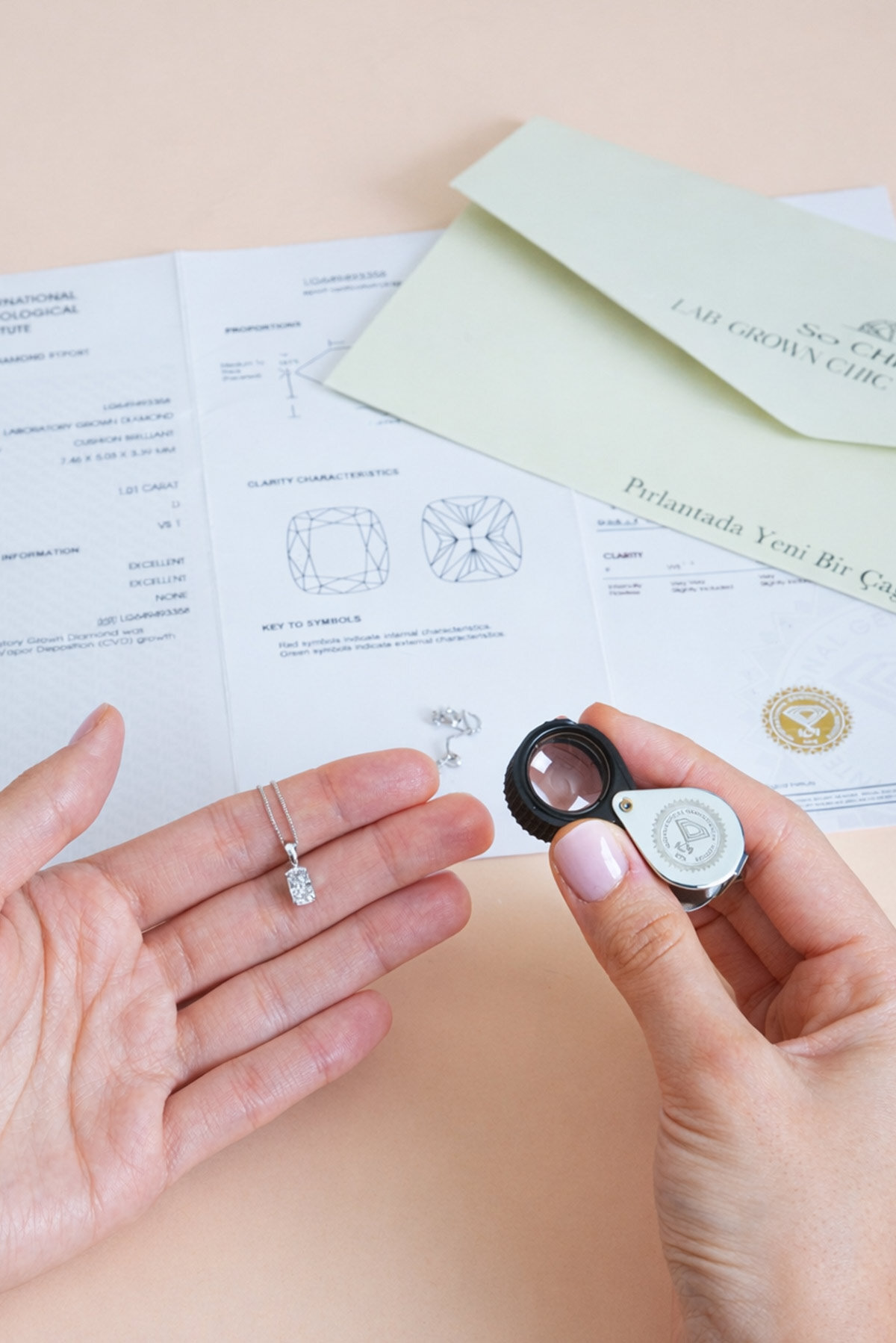 Kolyenizin merkezindeki pırlanta, dünyadaki tekil kimliğini belgeleyen LG649493358 benzersiz koduna sahiptir