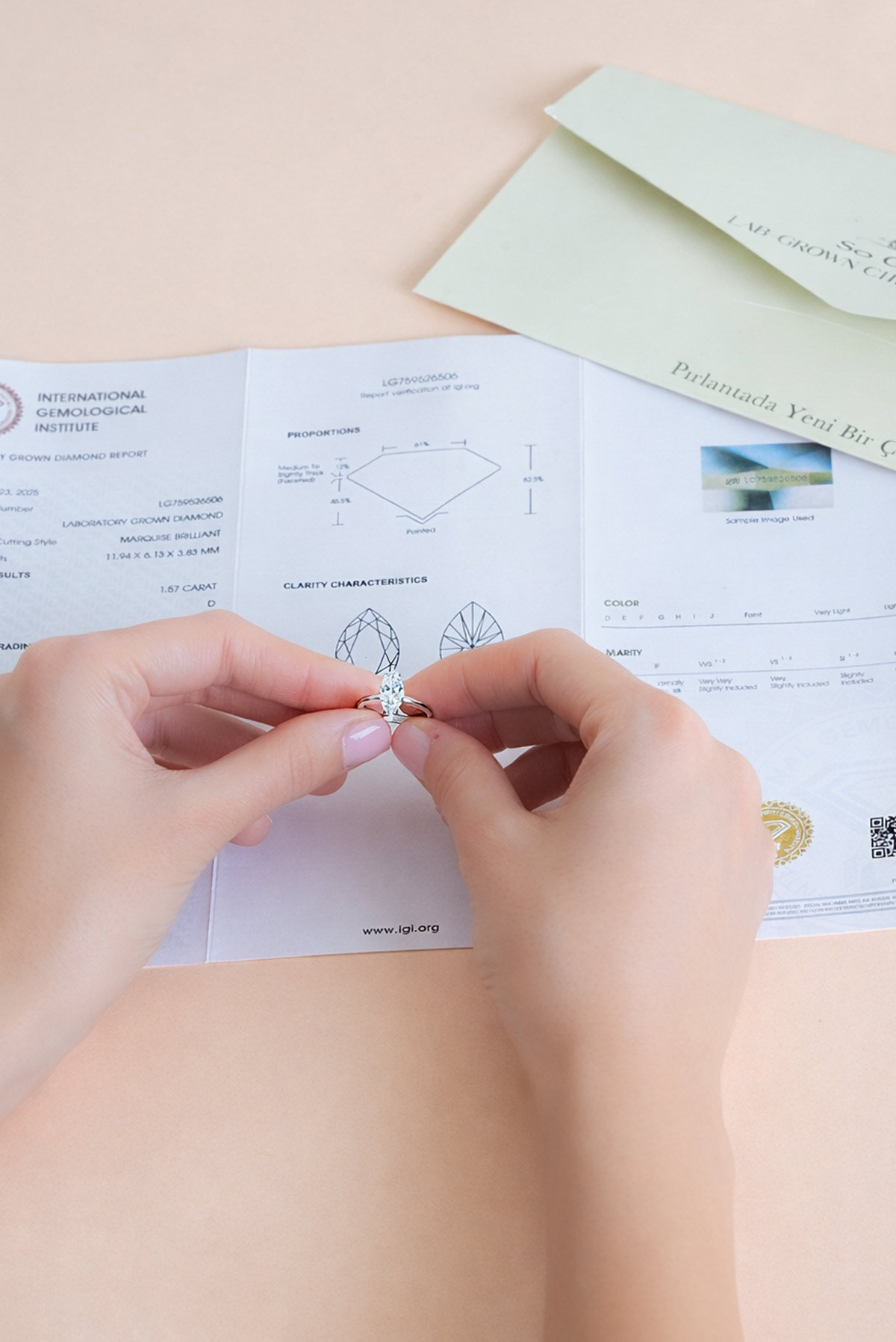Yüzüğünüzün merkezindeki 1.57 karatlık ana taş, pırlantanın dünyadaki tekil kimliğini belgeleyen LG759526506 benzersiz koduna sahiptir. IGI standartlarında onaylanan bu seri numarası, mücevherinizin orijinalliğini ve sadece size özel oluşunu tescilleyen dijital bir sertifika niteliğindedir.