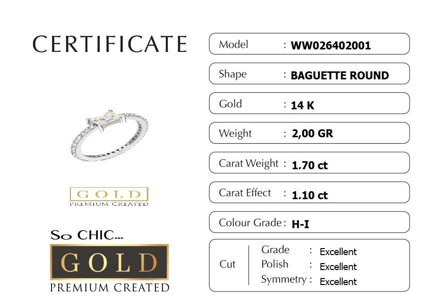 Gözlerinizi kamaştıracak bir deneyim. Sertifikalı Created taşın parlaklığı ve usta mücevher işçiliği ile üretilen Gold Premium serisi baget yüzüğünüzü günün her saati rahatlıkla kullanacaksınız!
