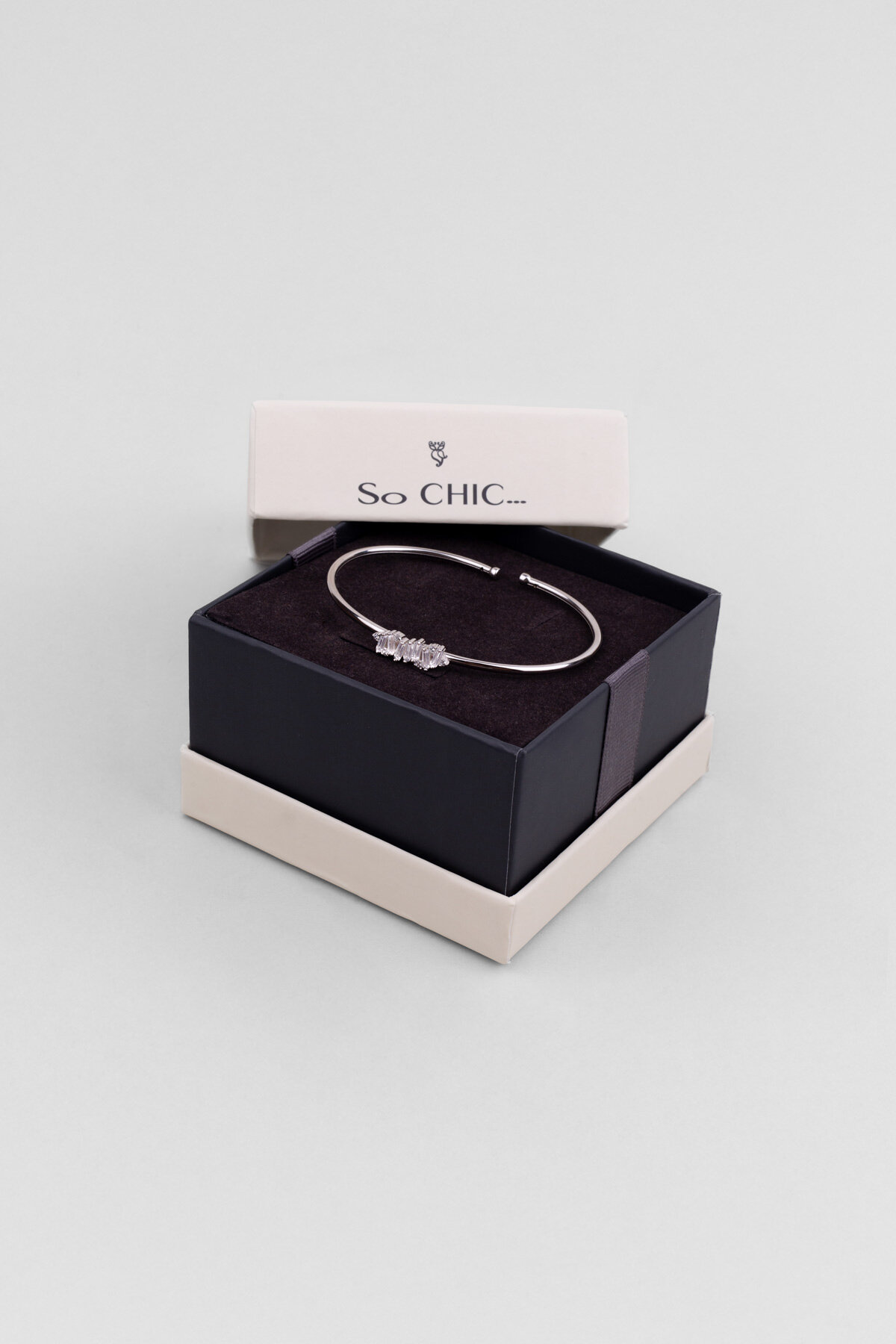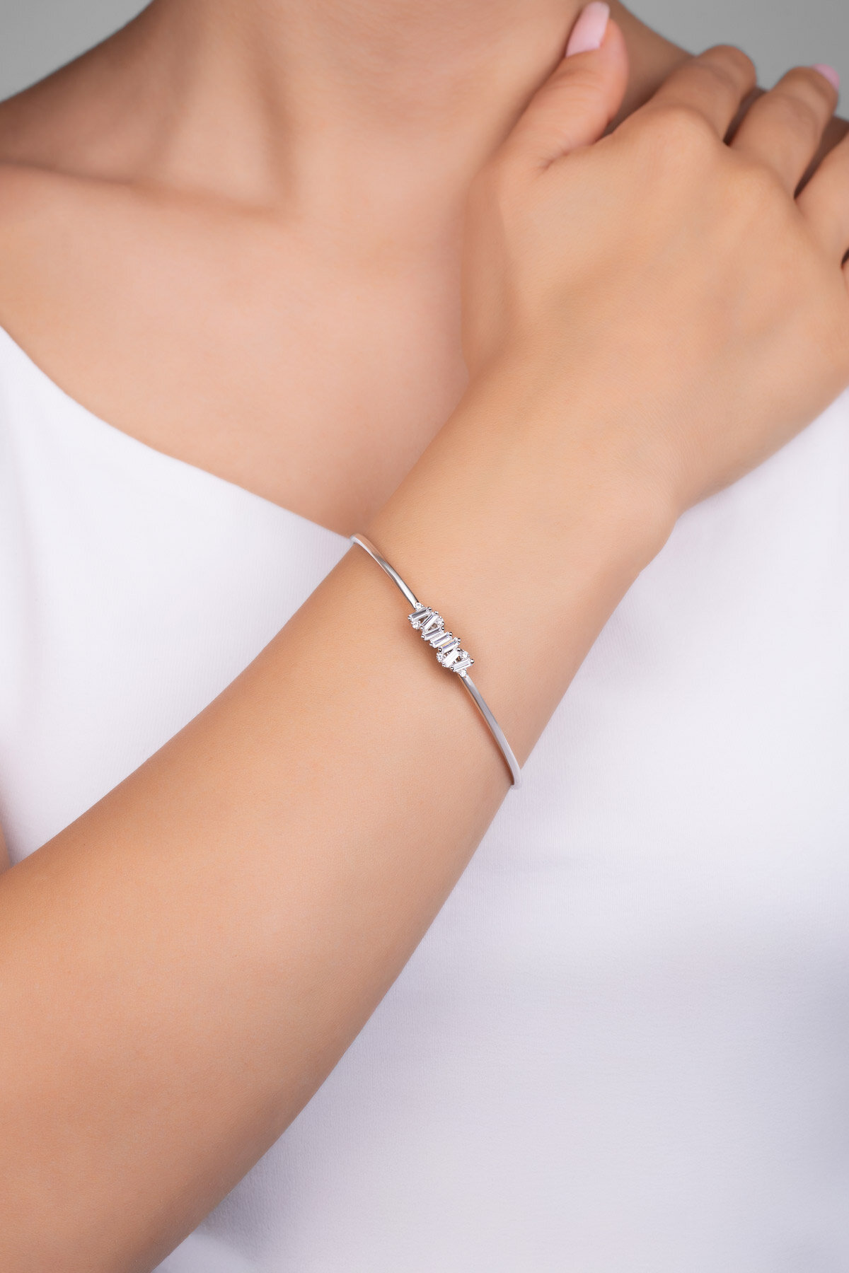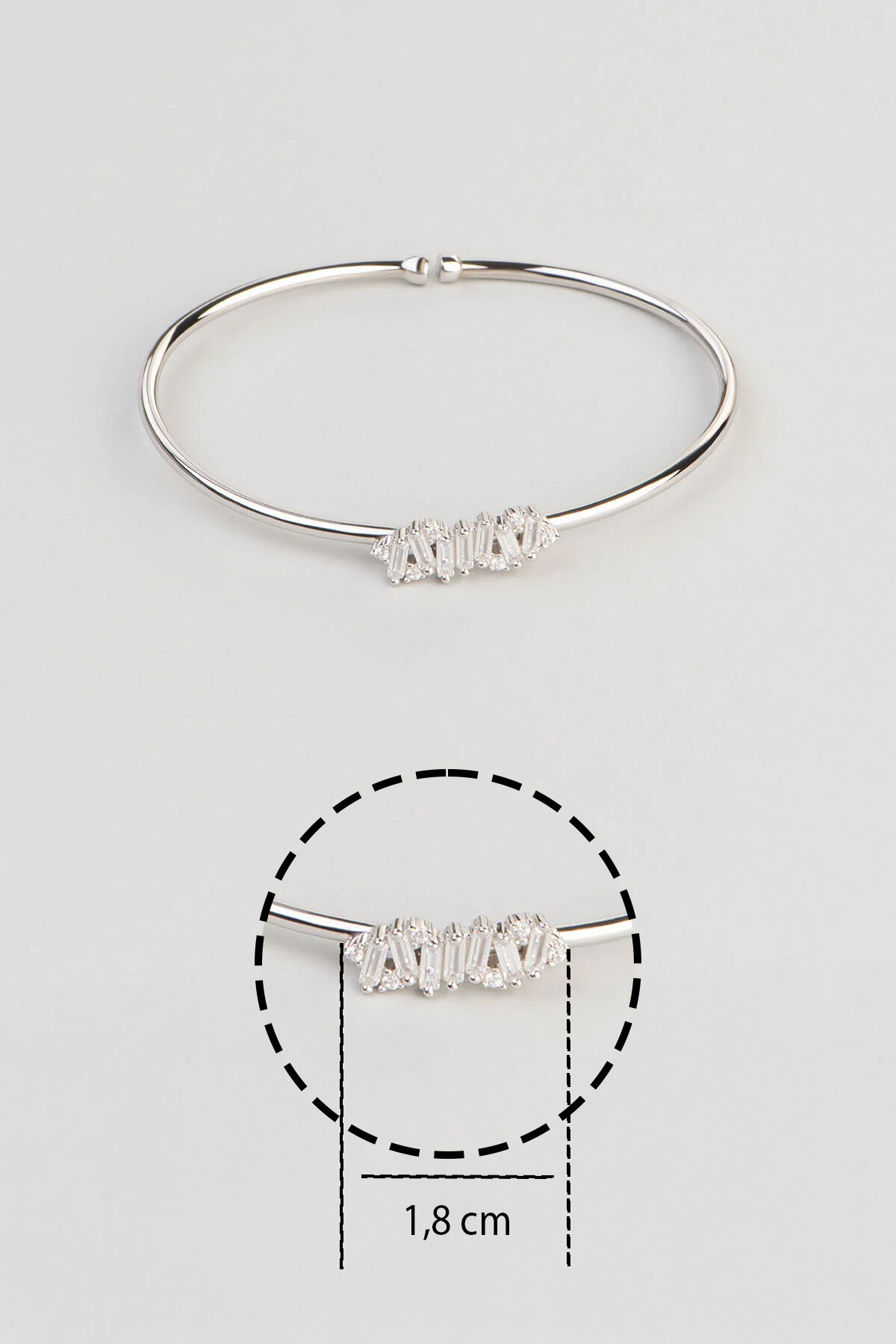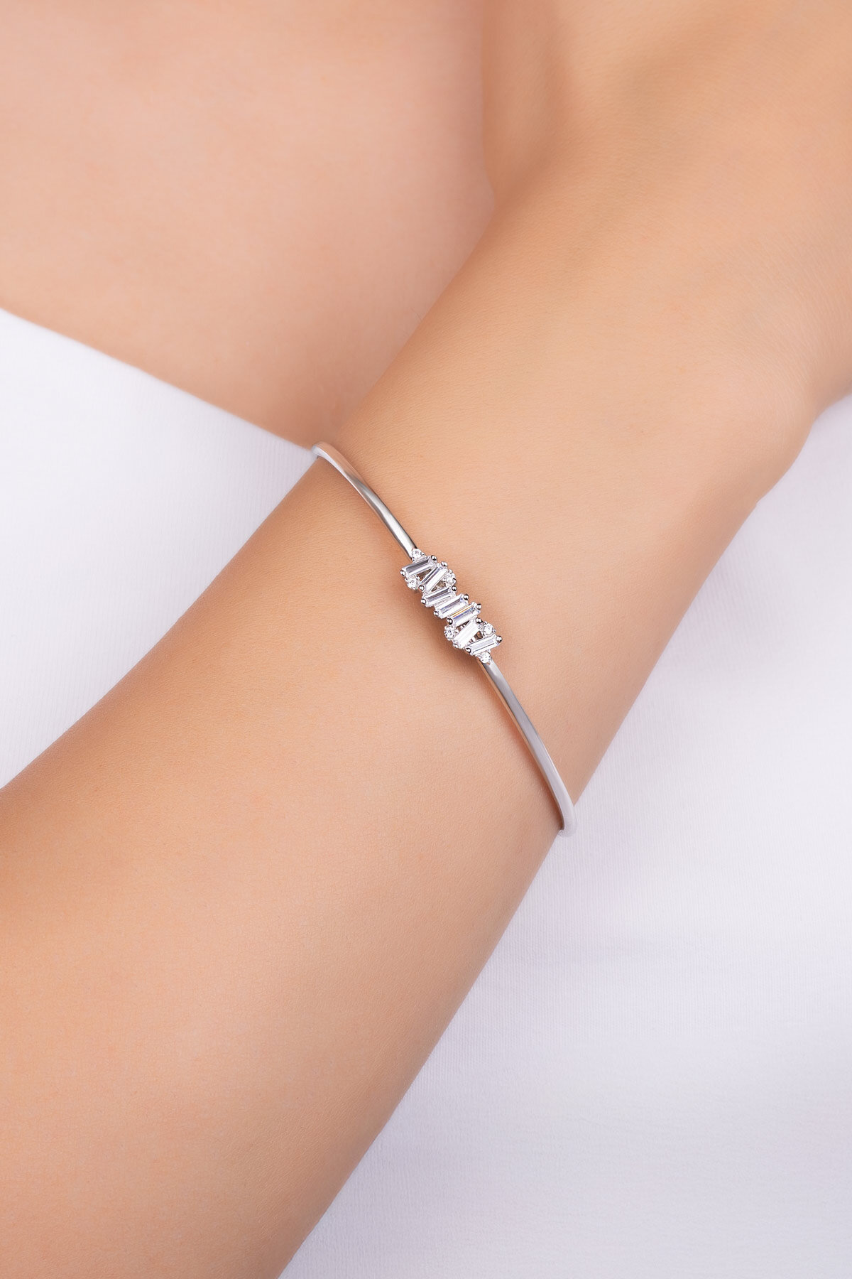 Baget taş detaylarıyla öne çıkan bu kelepçe bileklik, modern çizgileri zamansız bir şıklıkla buluşturur. Net hatlı formu ve ışıltılı duruşu sayesinde tek başına güçlü bir stil tamamlayıcısı olurken, günlük ve özel kombinlere sofistike bir dokunuş katar.