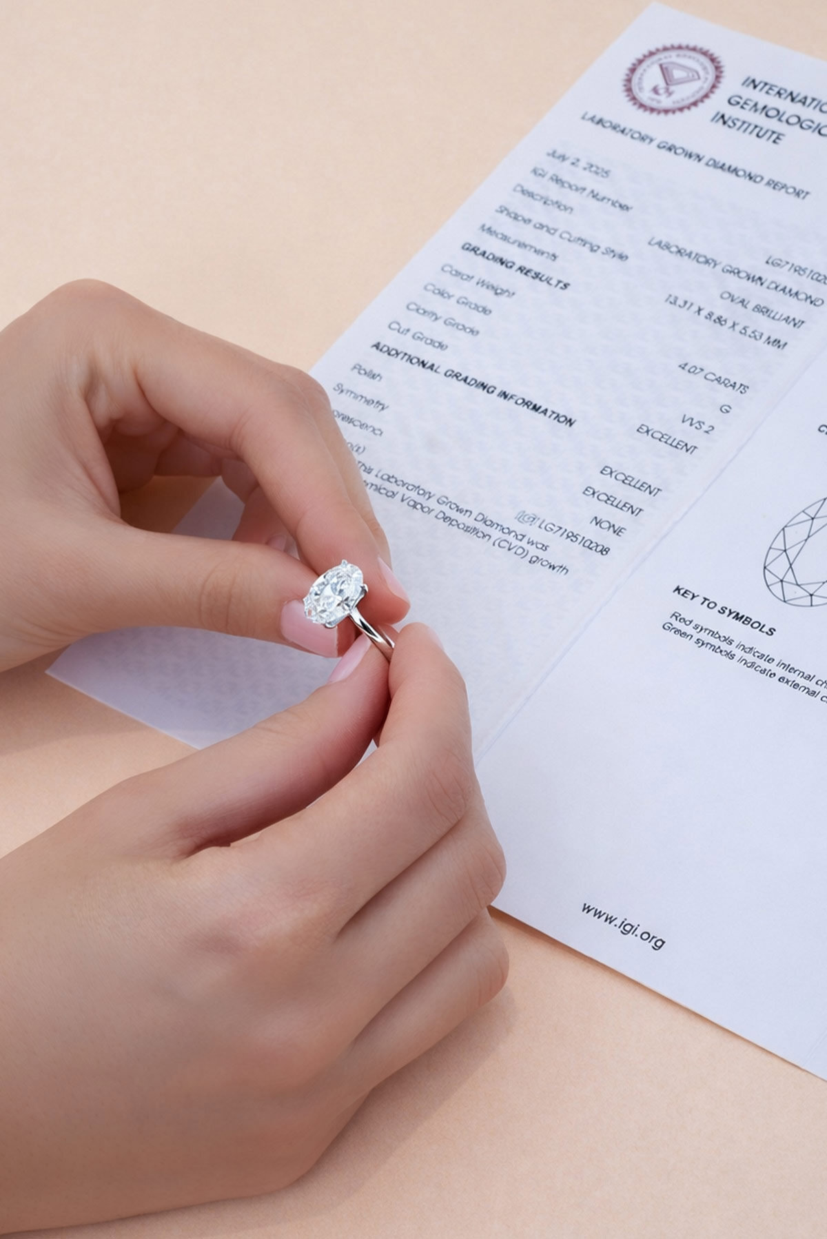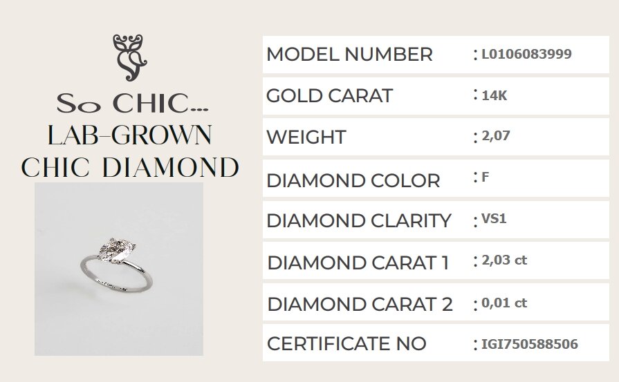 Yüzüğünüzün merkezindeki 2.03 karatlık görkemli pırlanta, dünyadaki tekil kimliğini belgeleyen LG750588506 benzersiz koduna sahiptir.