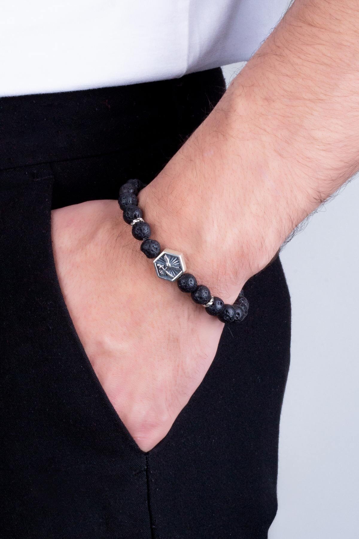 Attila Kılıcı Gümüş Lav Taşlı Ayarlanabilir Erkek Bileklik