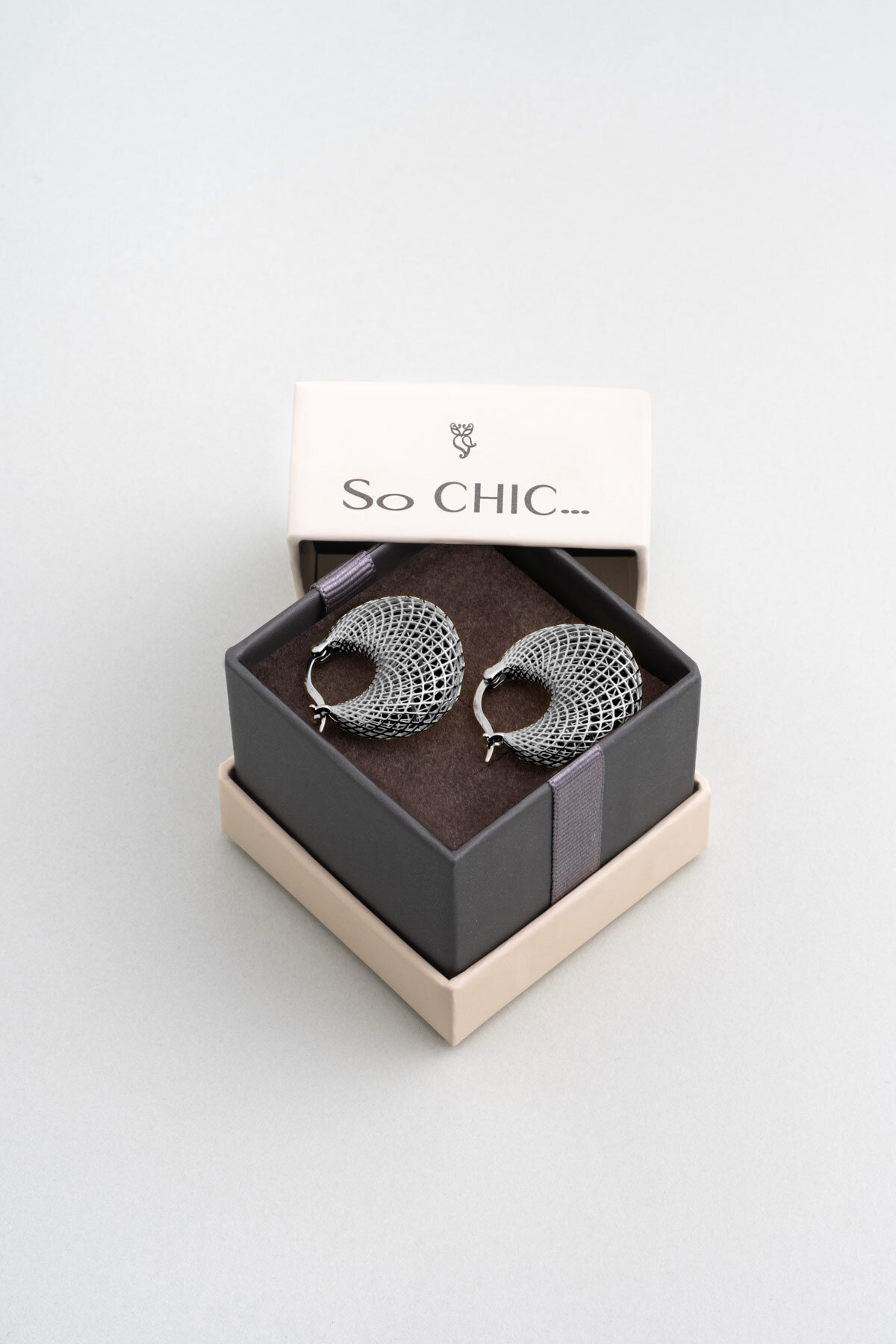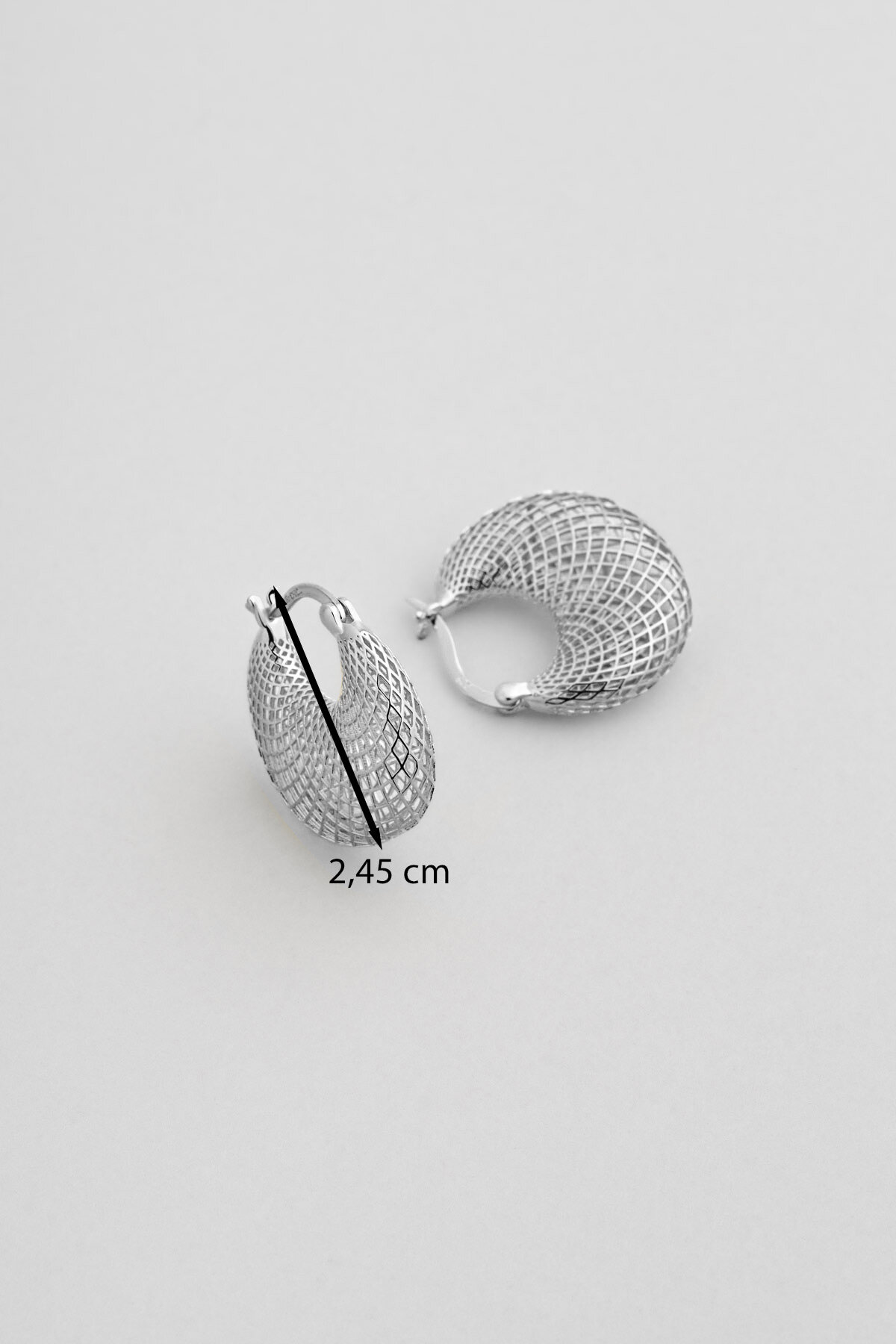 Ay Tanrıçası halka küpe, zarif kafes dokulu tasarımıyla dikkat çeker. Yumuşak hatları ve ince işçiliği, klasik halka formuna modern bir hareket katarak her stile feminen ve etkileyici bir ışıltı sunar.