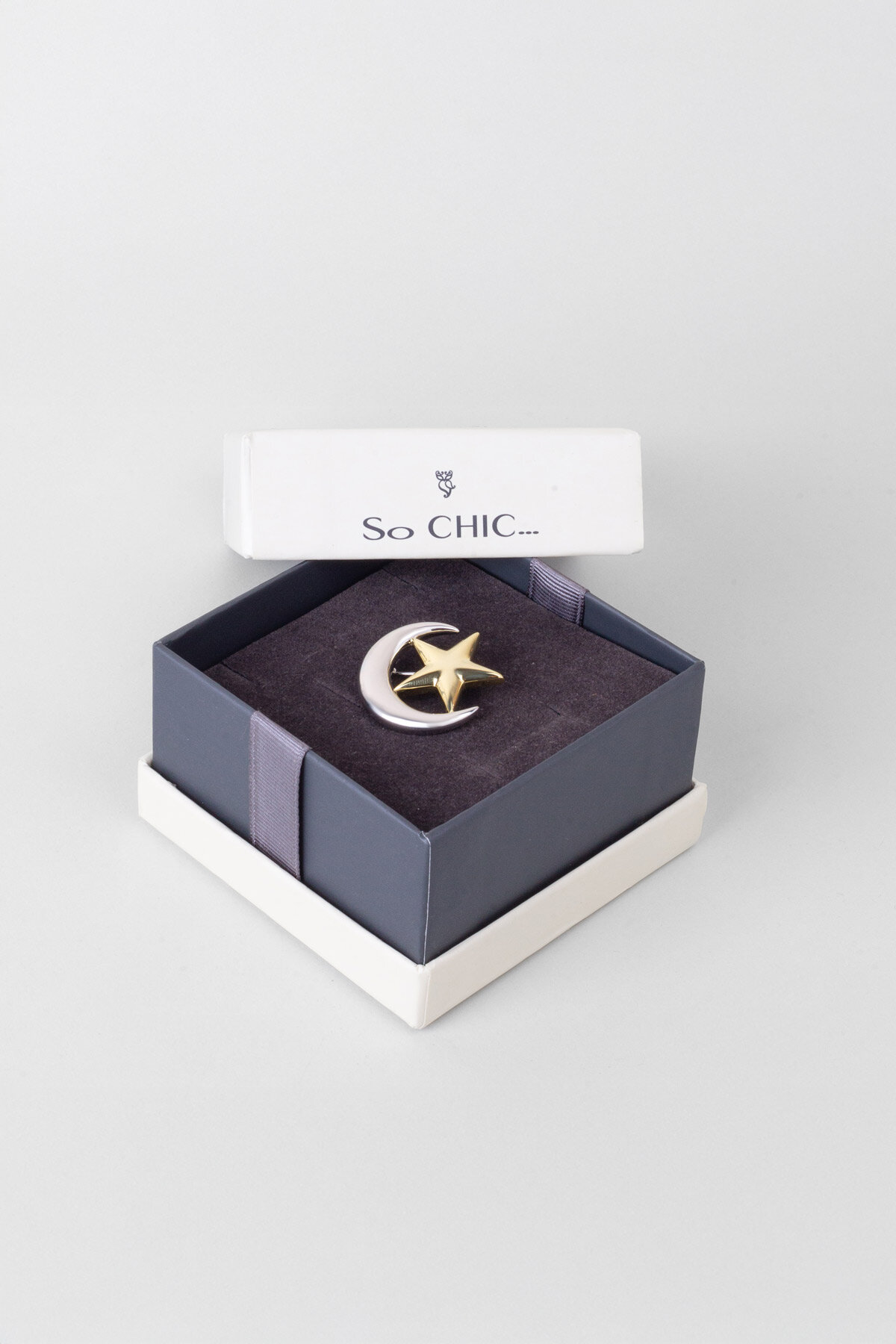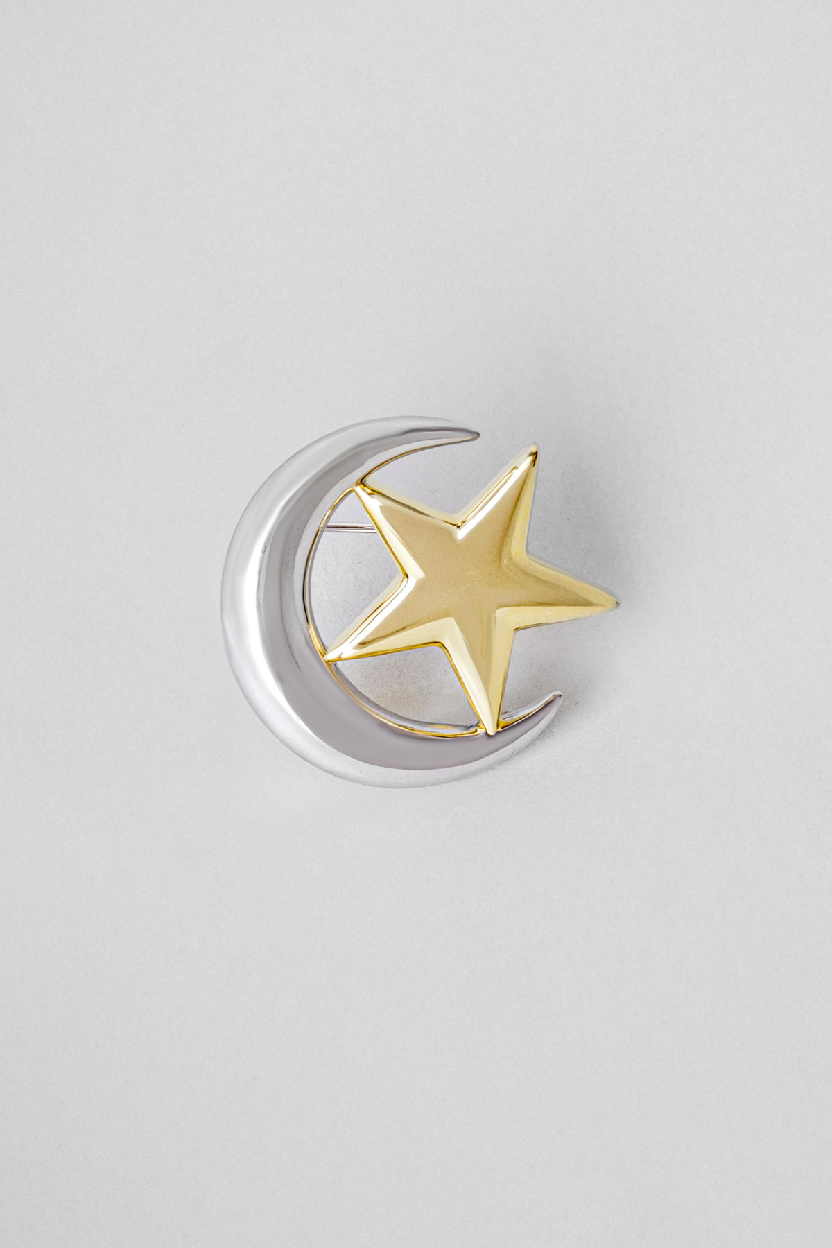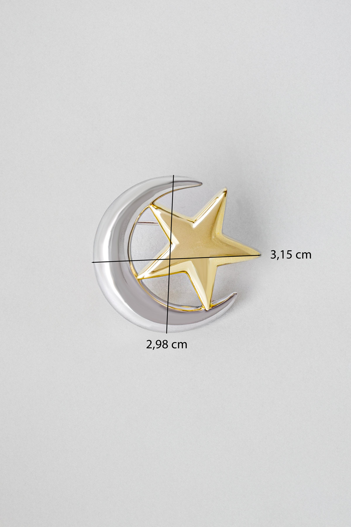 Asaletin ve zarafetin simgesi ay ve yıldız formu, sarı ve beyaz altın kaplama detaylarla modern bir şıklık sunar. Gümüş zemin üzerine tasarlanan bu özel broş, ceket, şal ve elbise kombinlerine anlamlı ve güçlü bir dokunuş katar.