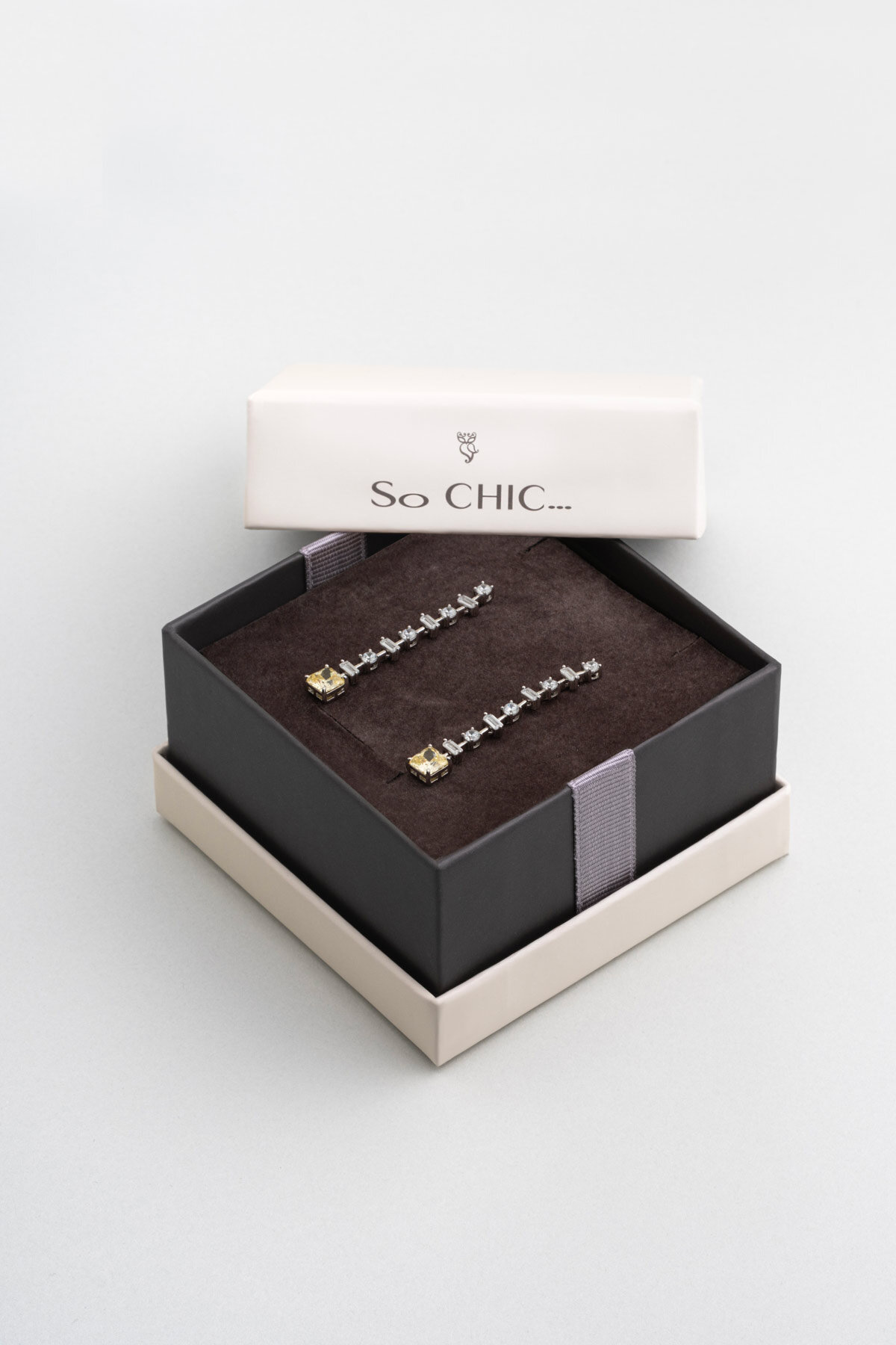 Baget Güneşi gümüş küpe, baget kesim taşların güneş ışınlarını andıran dizilimiyle ışıltıyı merkezine alır. Gümüşün net duruşuyla birleşen tasarım, yüz hatlarını aydınlatan güçlü ve modern bir etki yaratır.