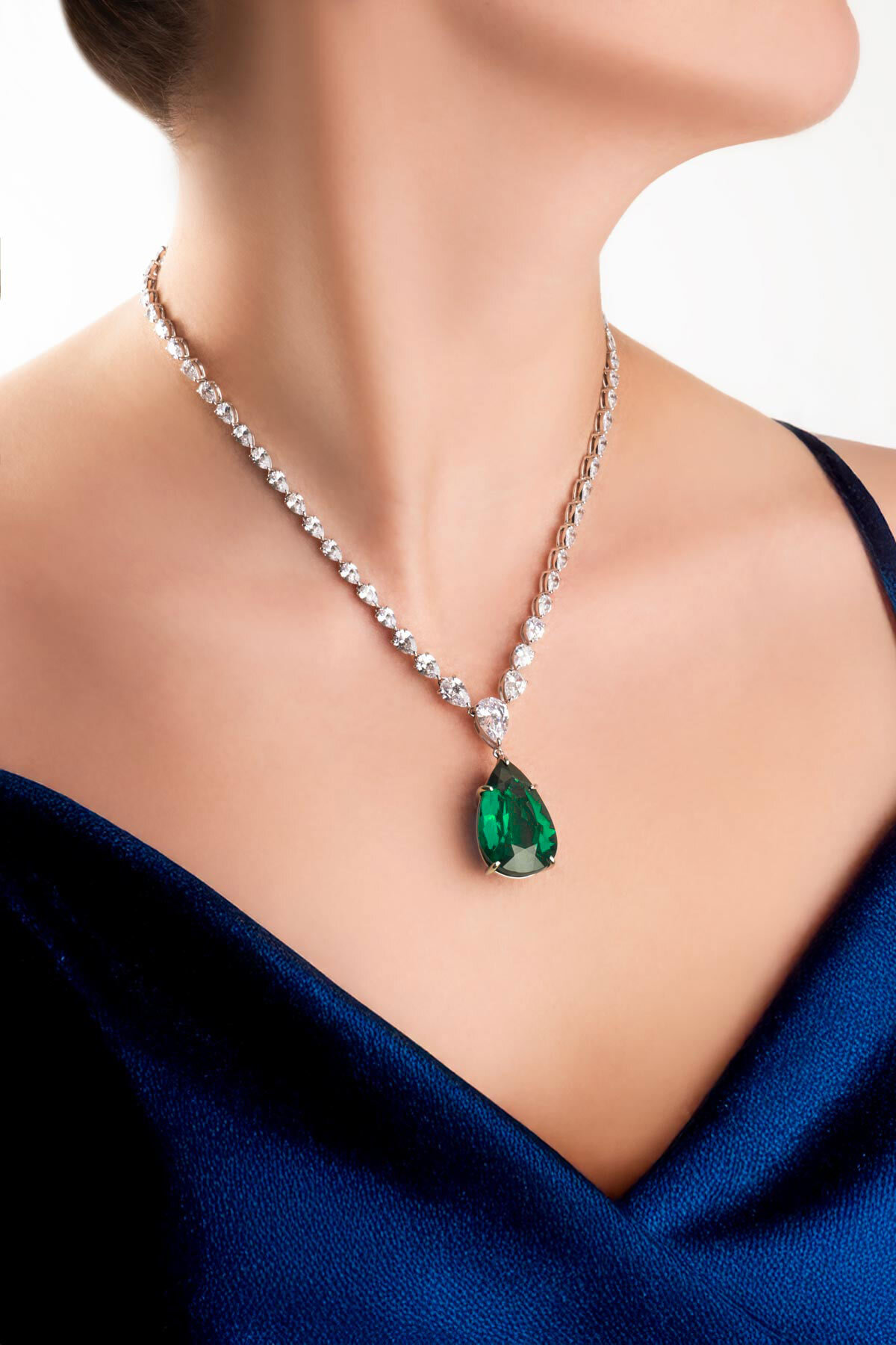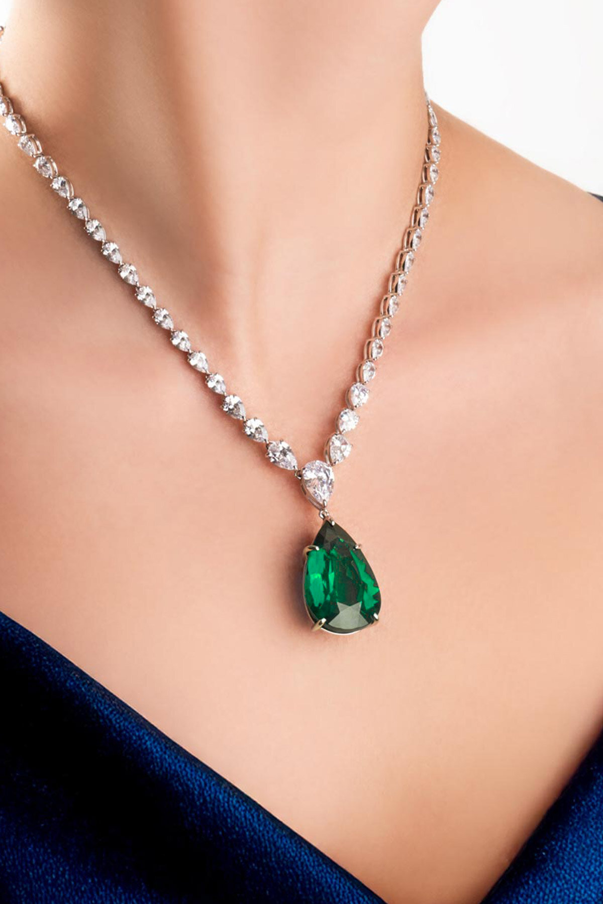 Büyülü Yeşil 18 Ayar Beyaz Altın Kaplama 44 Cm Gümüş Gerdanlık