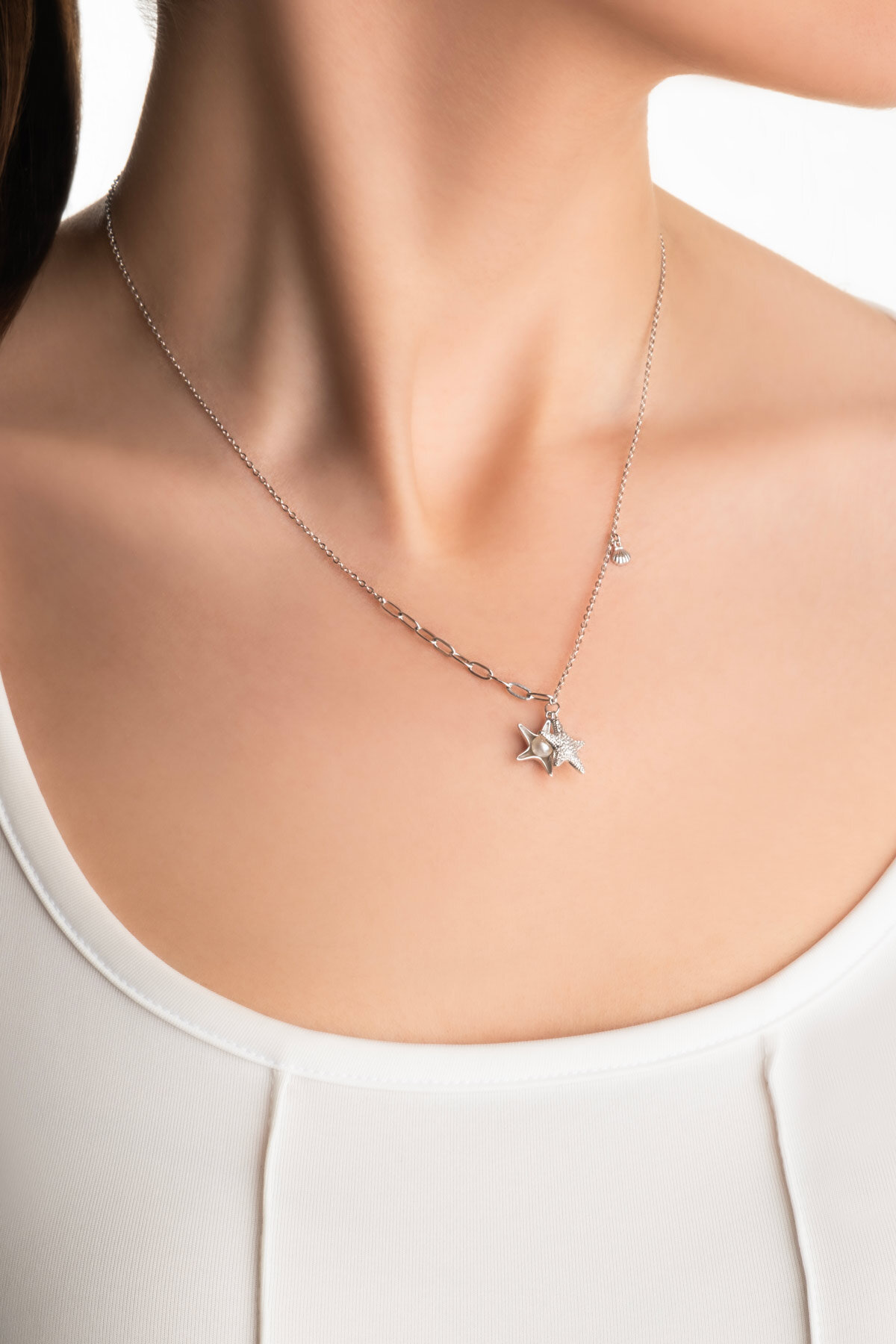 Doğal İnci Deniz Yıldızı 18 Ayar Beyaz Altın Kaplama 45 Cm Gümüş Kolye