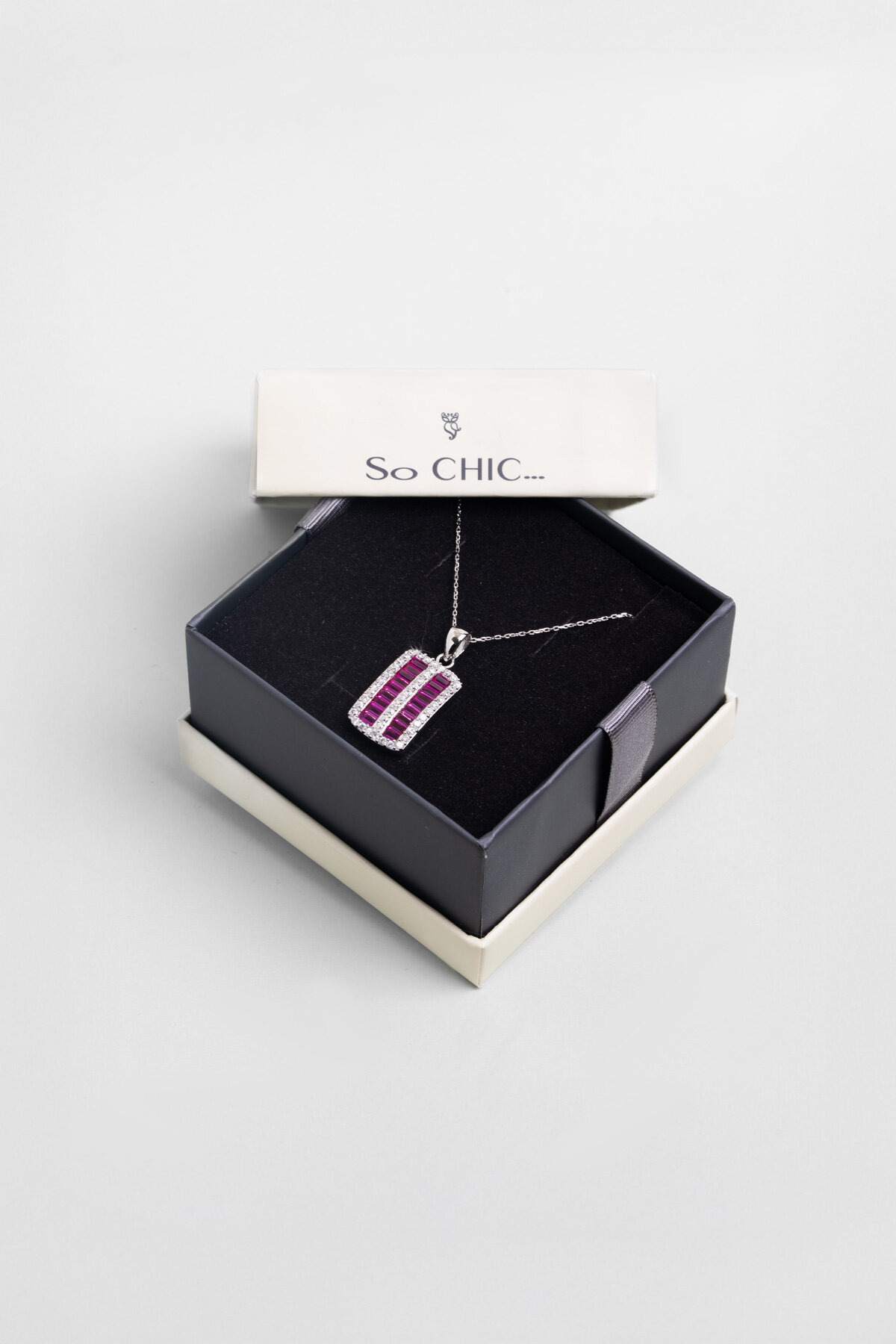 43 cmlik kusursuz bir hat üzerinde yükselen baget kesim taşlar, fuşyanın mistik enerjisiyle buluşuyor. Modern sanatın takıya dönüşmüş hali olan bu tasarım, So CHIC dokunuşuyla stilinize cesur bir imza atıyor.