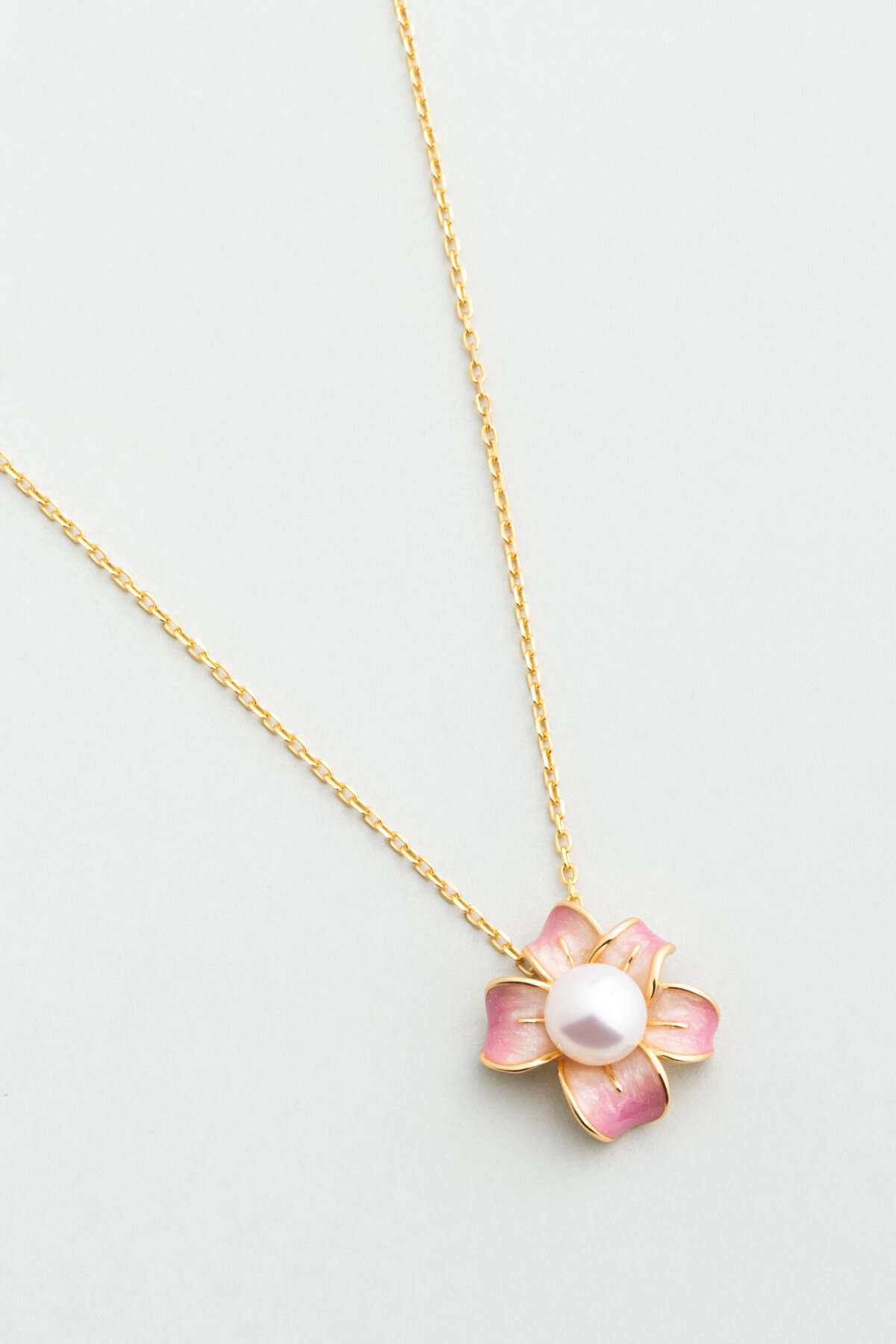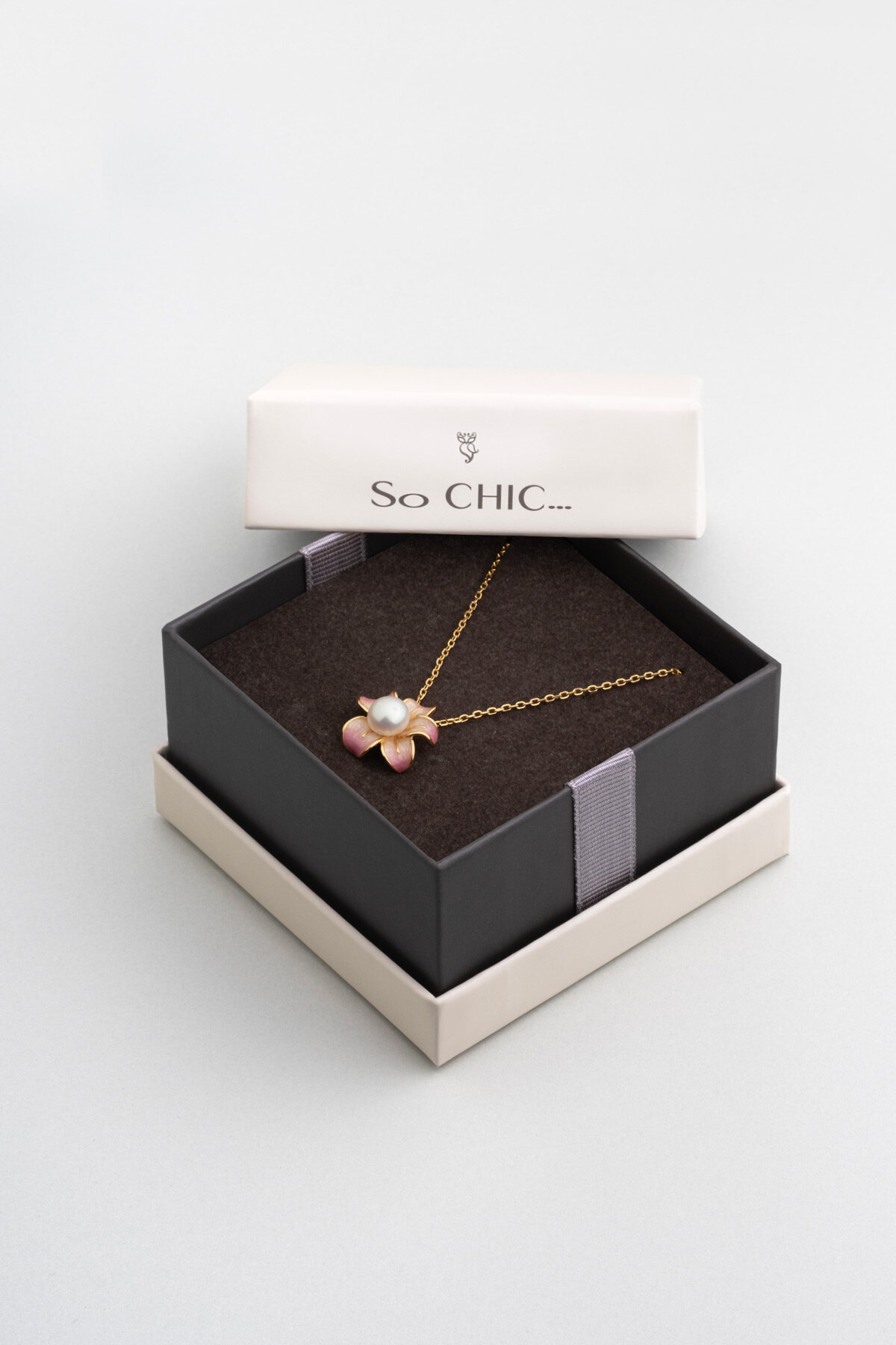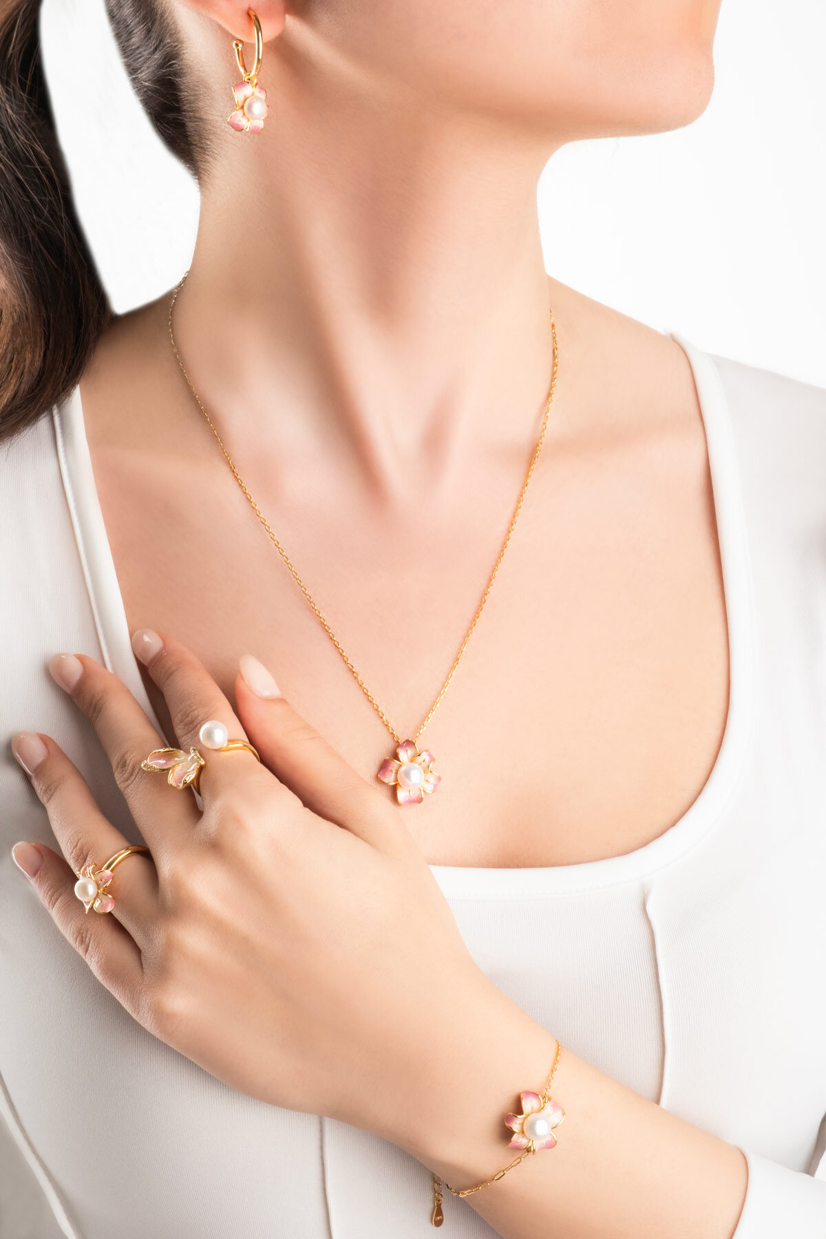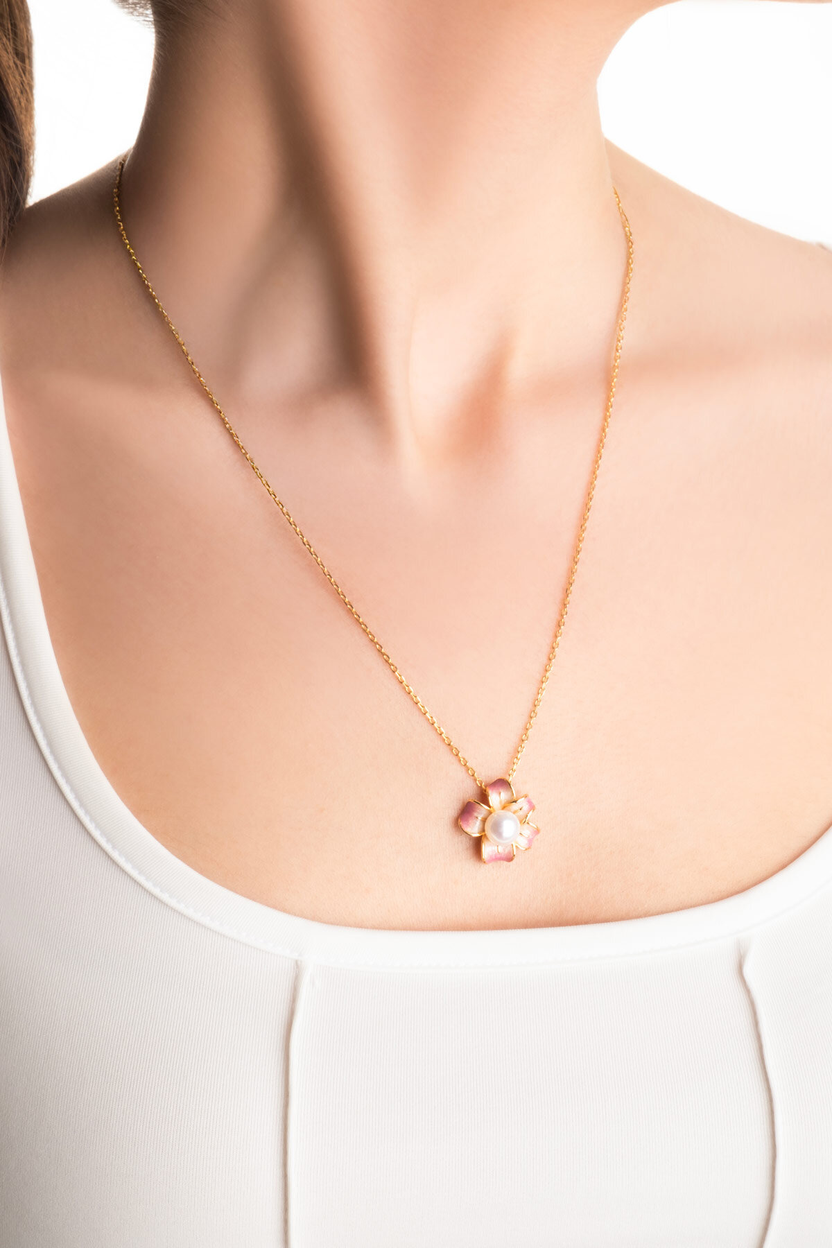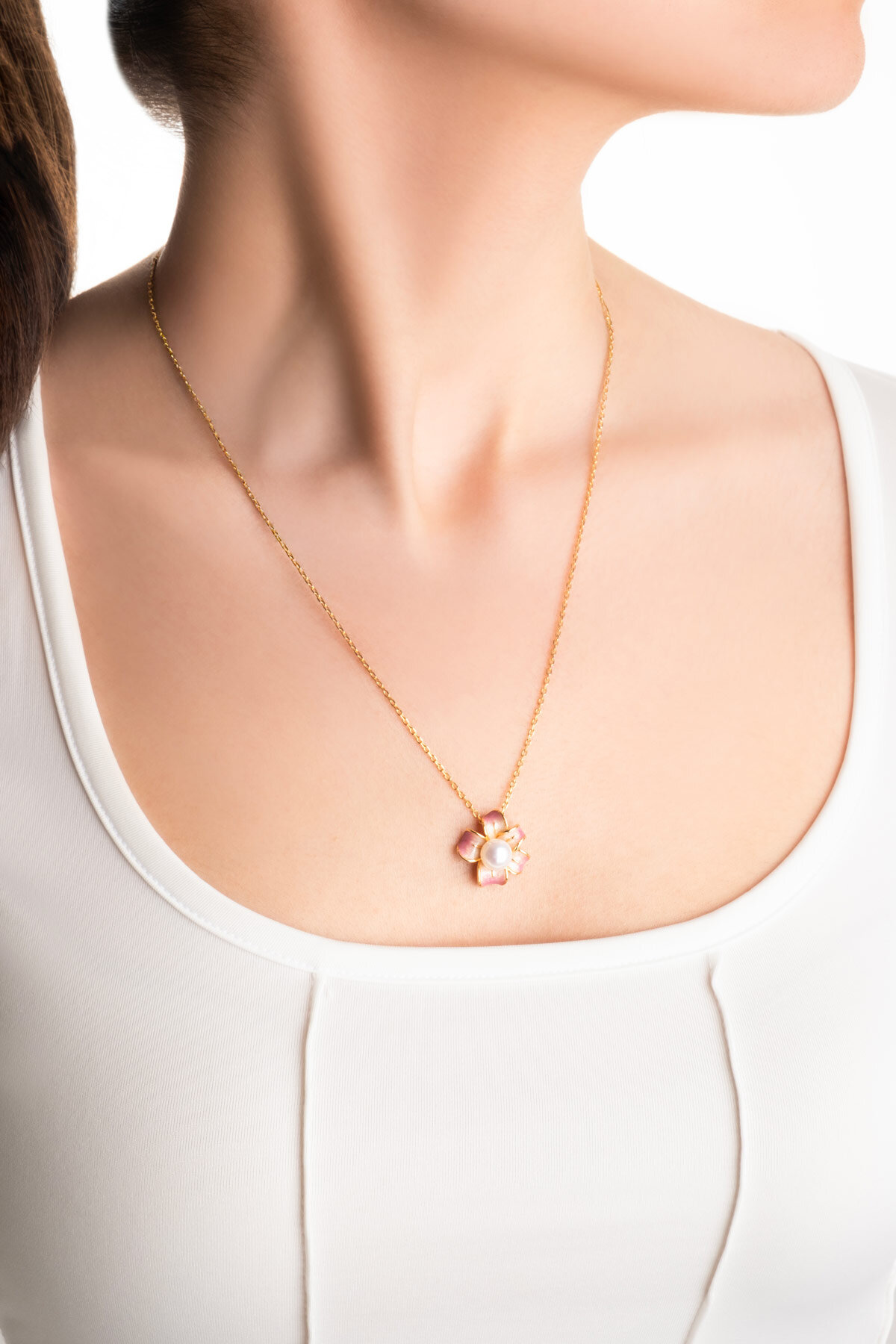 İnci taşla süslenen hibiskus çiçeği formundaki bu kolye, doğanın zarafetini romantik bir ışıltıyla birleştirir. İncelikli detaylarıyla boynunuzda çiçek gibi açar, her stile yumuşak ve etkileyici bir dokunuş katar.