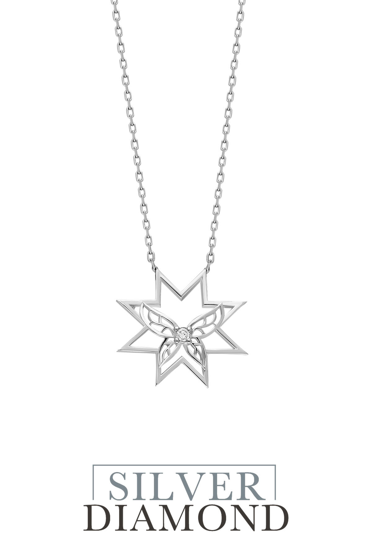 Kelebek Yıldızı 18 Ayar Beyaz Altın Kaplama 47 Cm Gümüş Pırlanta Kolye