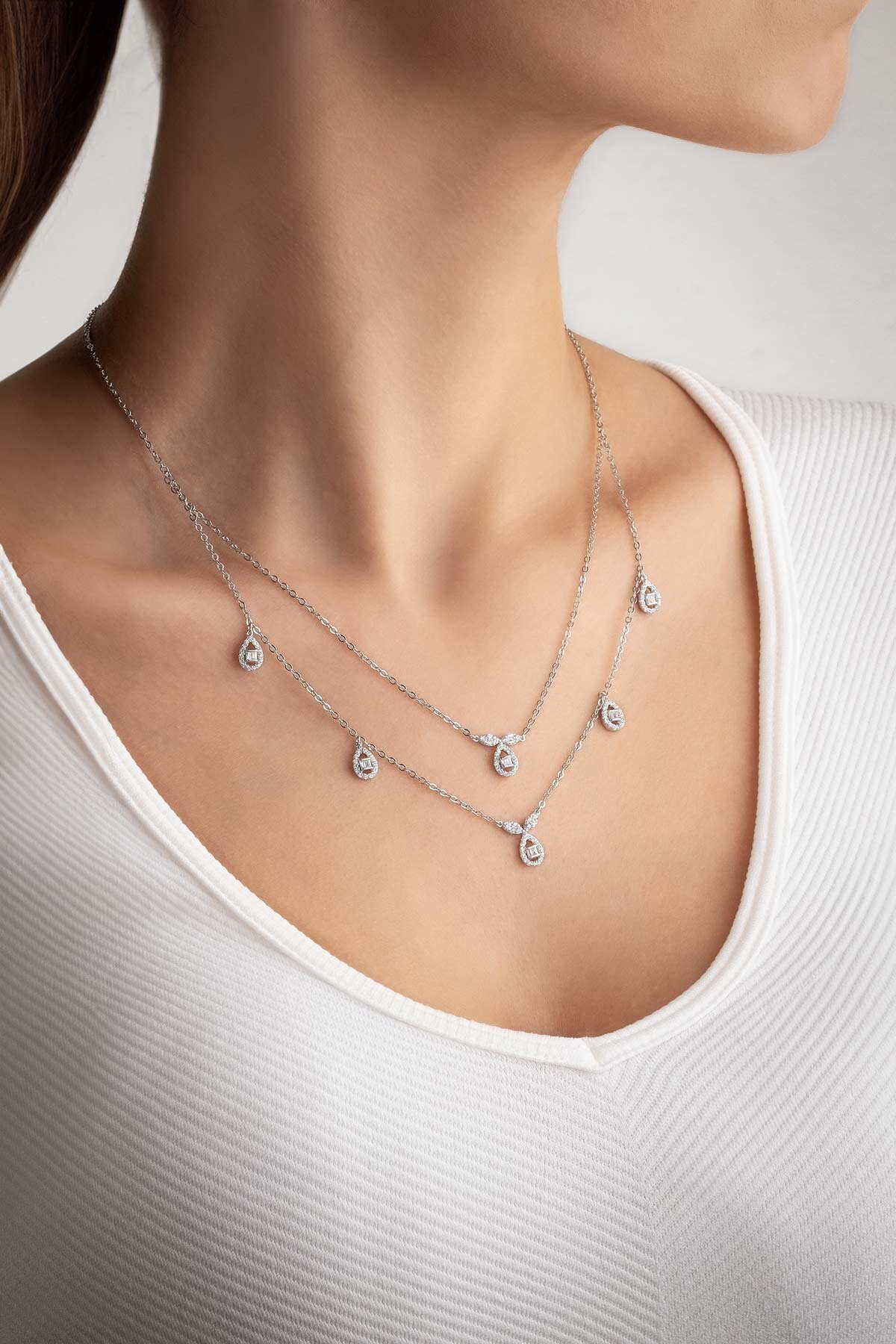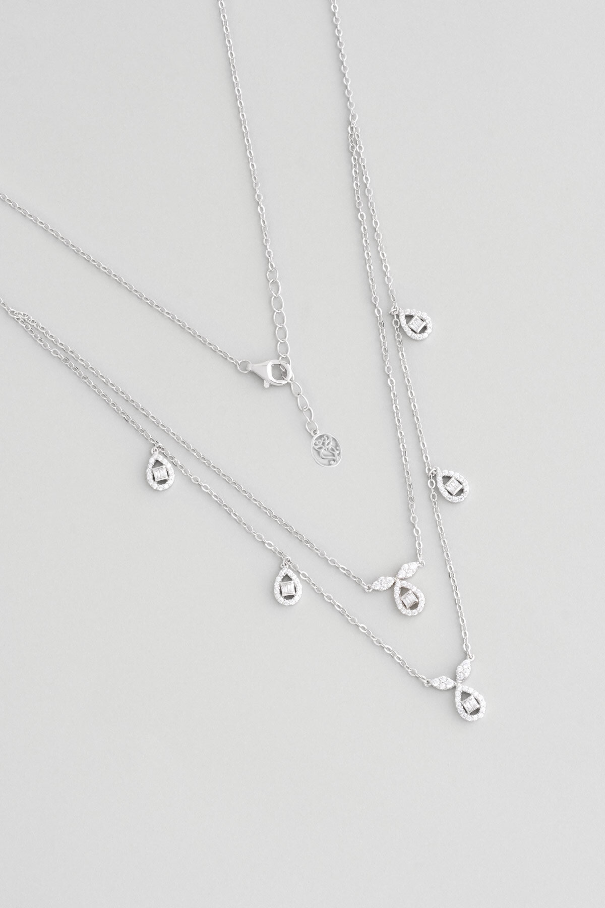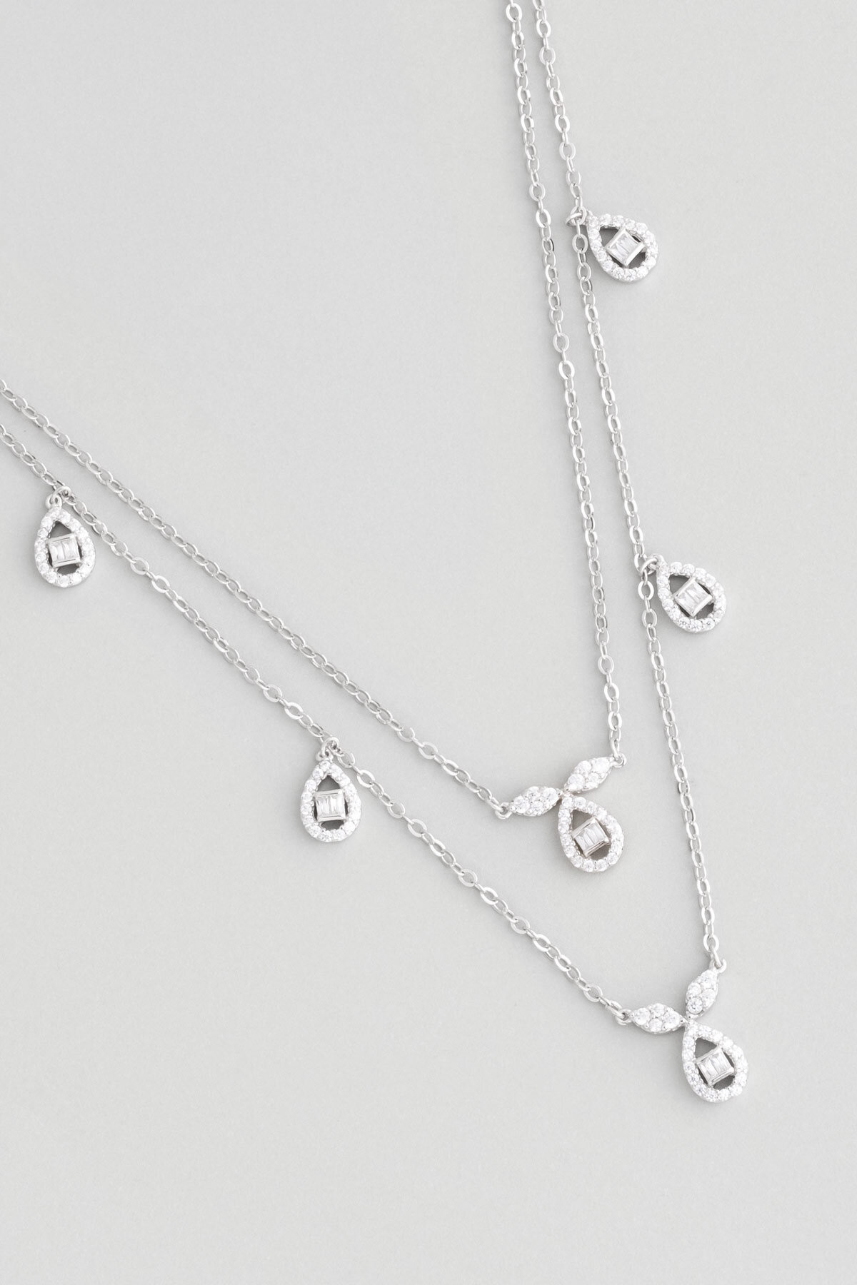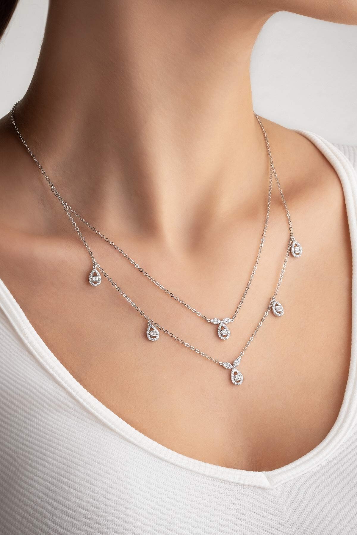 Klasik 18 Ayar Beyaz Altın Kaplama 47 Cm Gümüş İkili Kolye
