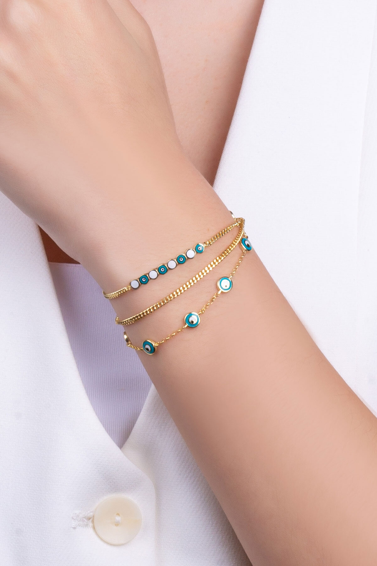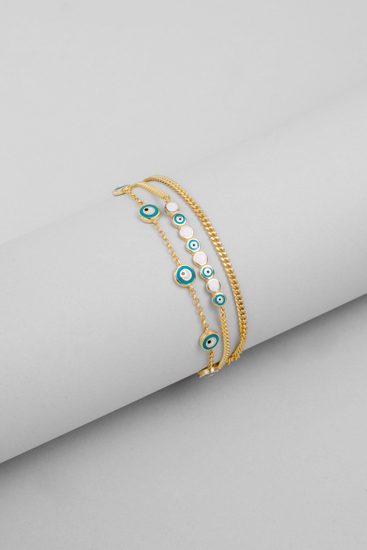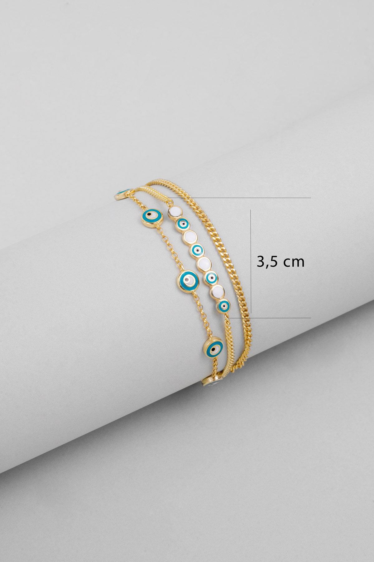 Nazar Işıltısı Üç Sıra 18 Ayar Sarı Altın Kaplama 20 Cm Gümüş Bileklik