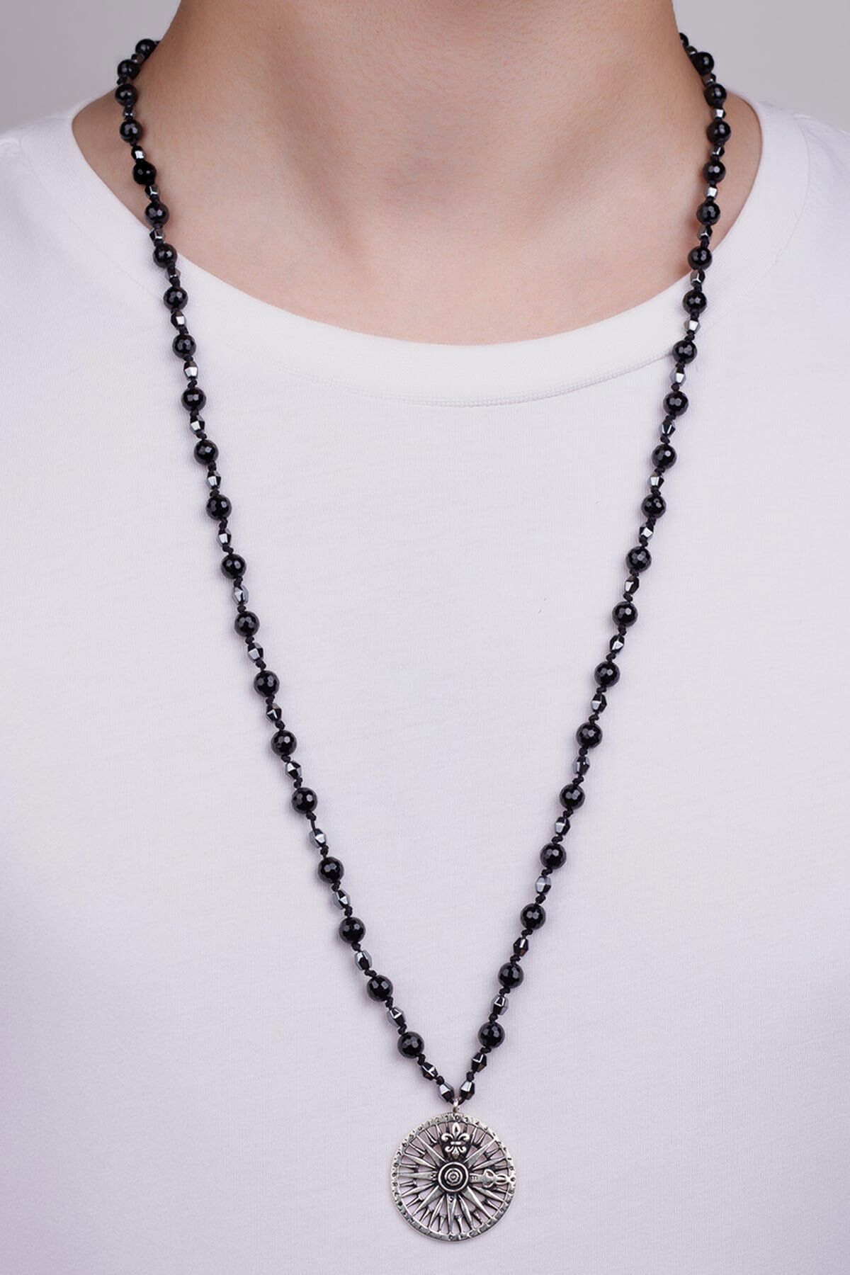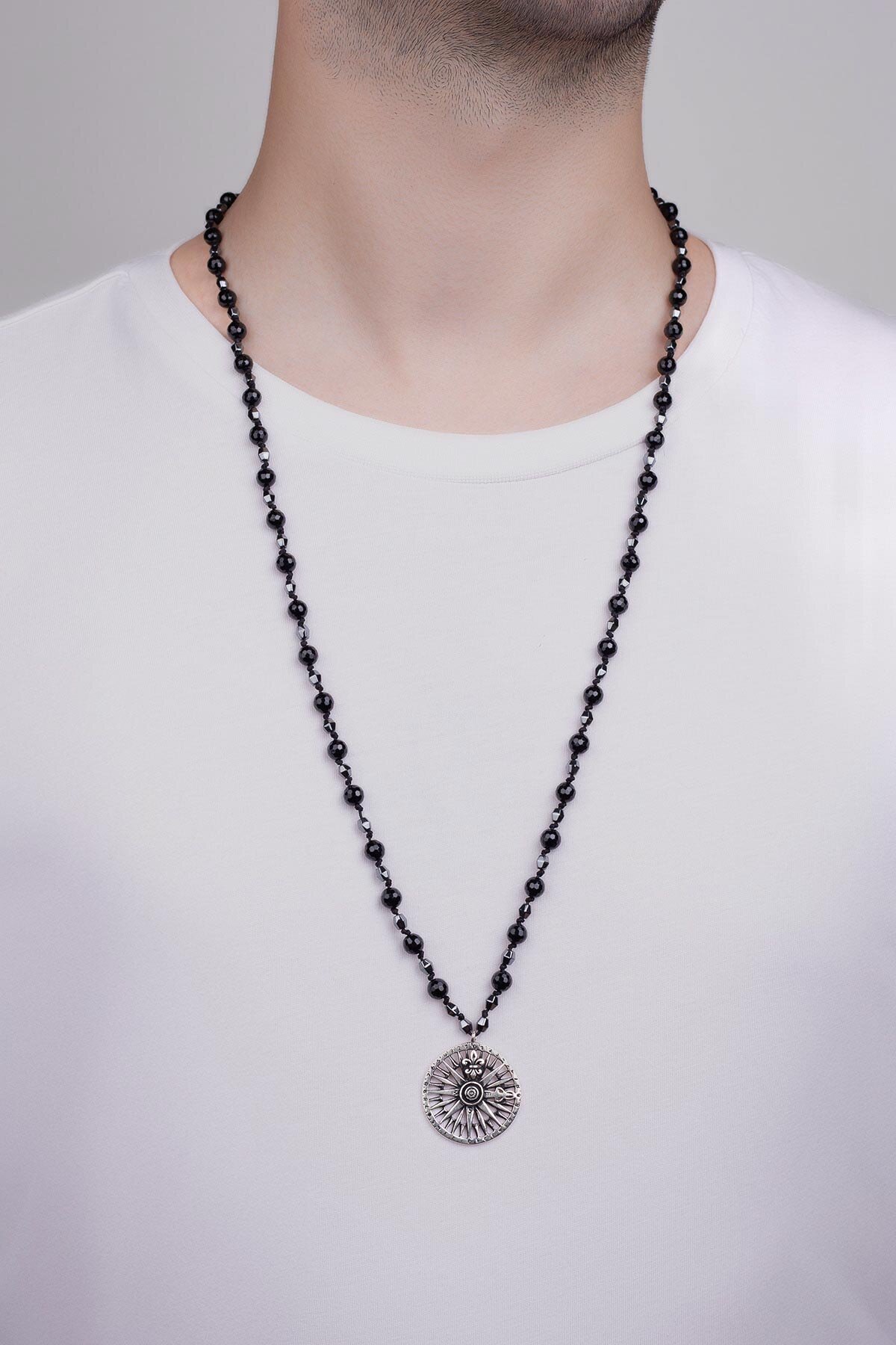 Oniks ve Hematit Taşlı 80 Cm Gümüş Pusula Erkek Kolye