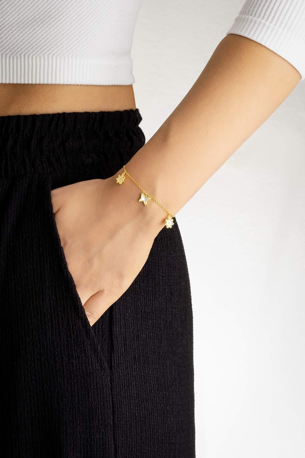 Sedef Çiçeği 18 Ayar Sarı Altın Kaplama 20 Cm Gümüş Minimal Bileklik