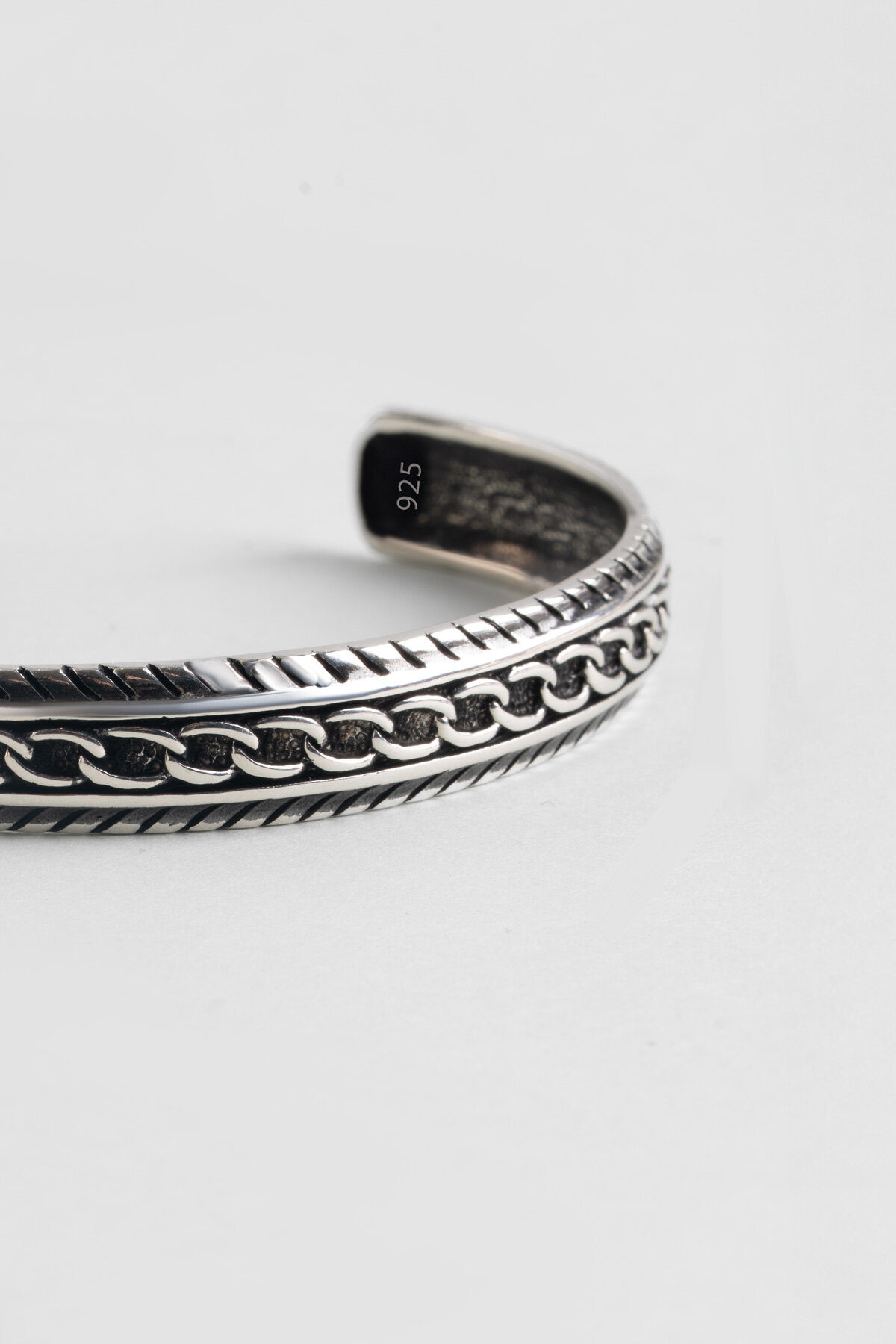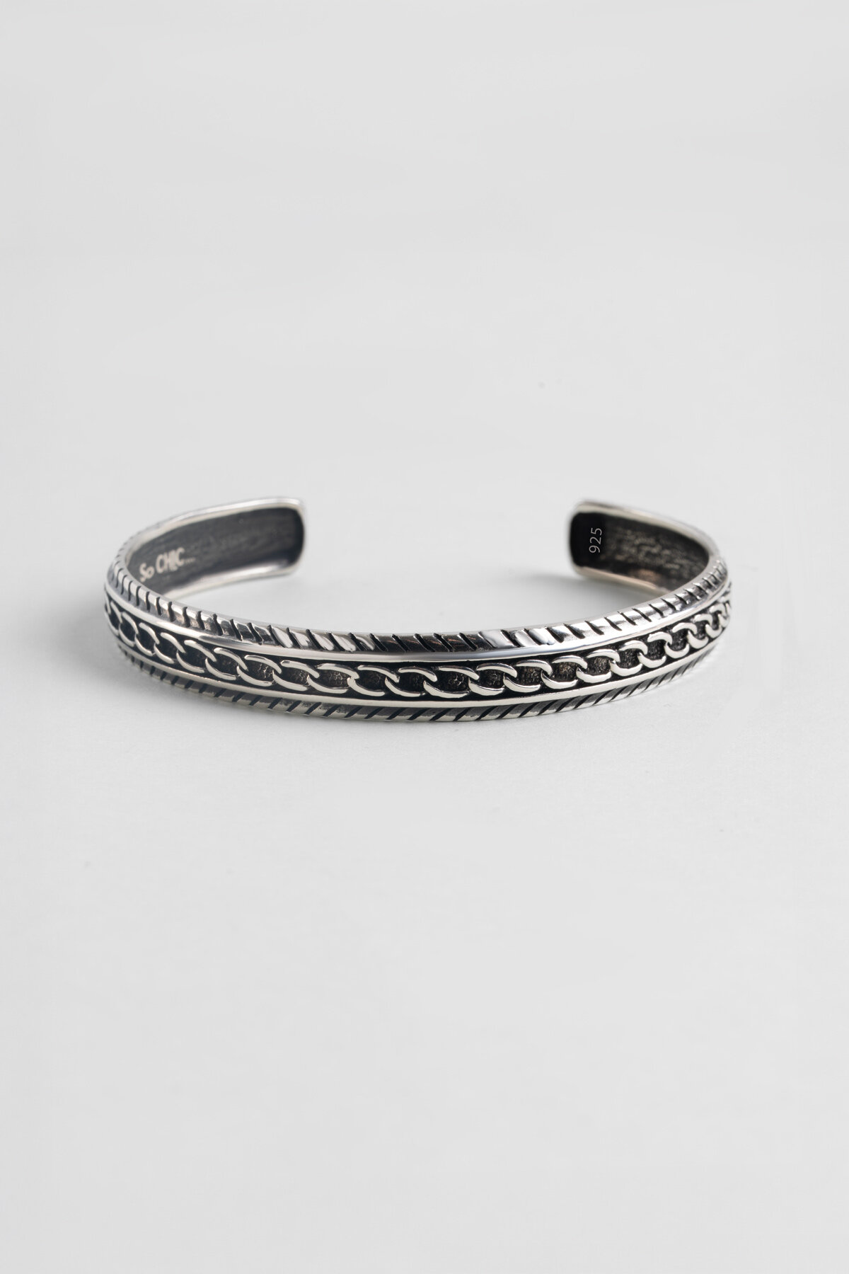 Zincir Detaylı Gümüş Erkek Kelepçe Bileklik