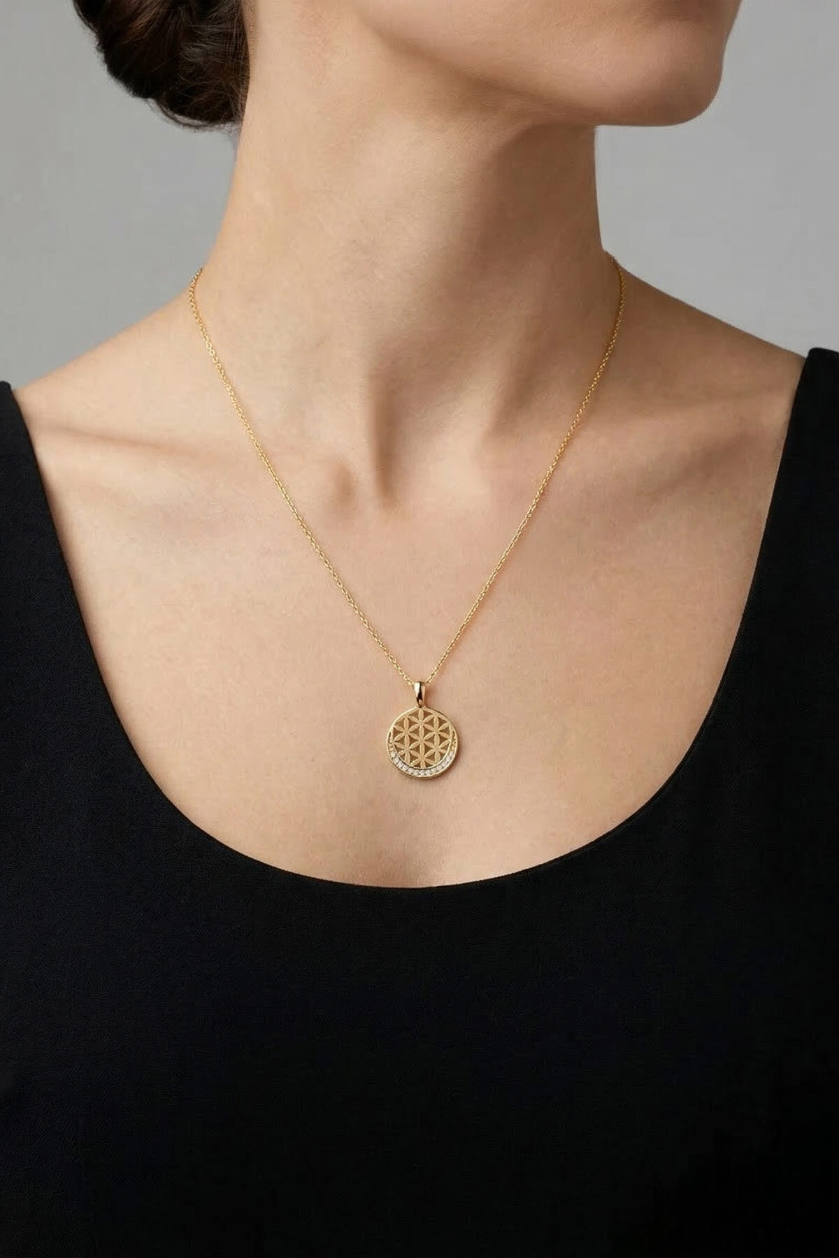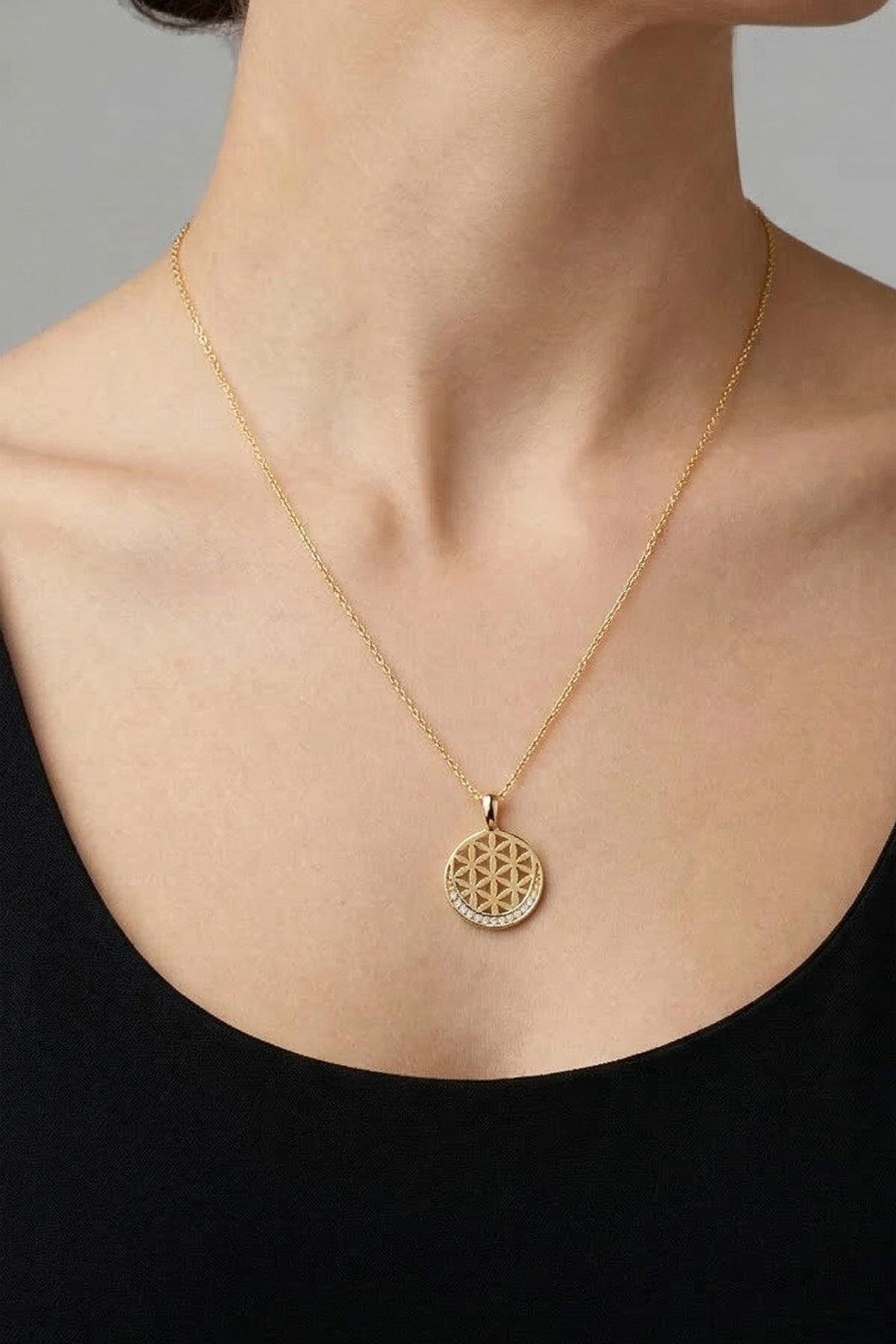 Zirkon Taş Detaylı Yaşam Çiçeği Figürlü 18 Ayar Sarı Altın Kaplama 45 Cm Gümüş Kolye